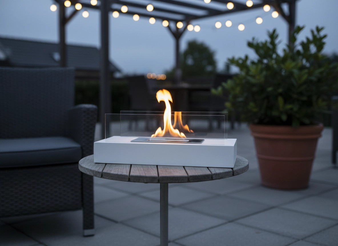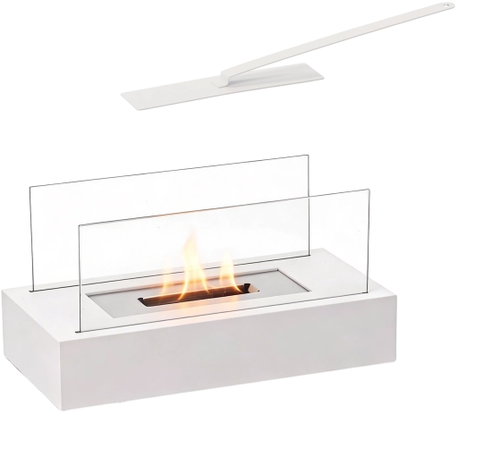 Cheminée de table compacte au bioéthanol créant une flamme naturelle sans fumée ni suie, qui instaure instantanément une ambiance chaleureuse à la maison comme sur la terrasse. Son design blanc élégant avec deux écrans en verre s’intègre aux intérieurs modernes et, grâce à sa utilisation simple sans conduit, constitue une décoration parfaite ainsi qu’une source de chaleur d’ambiance.