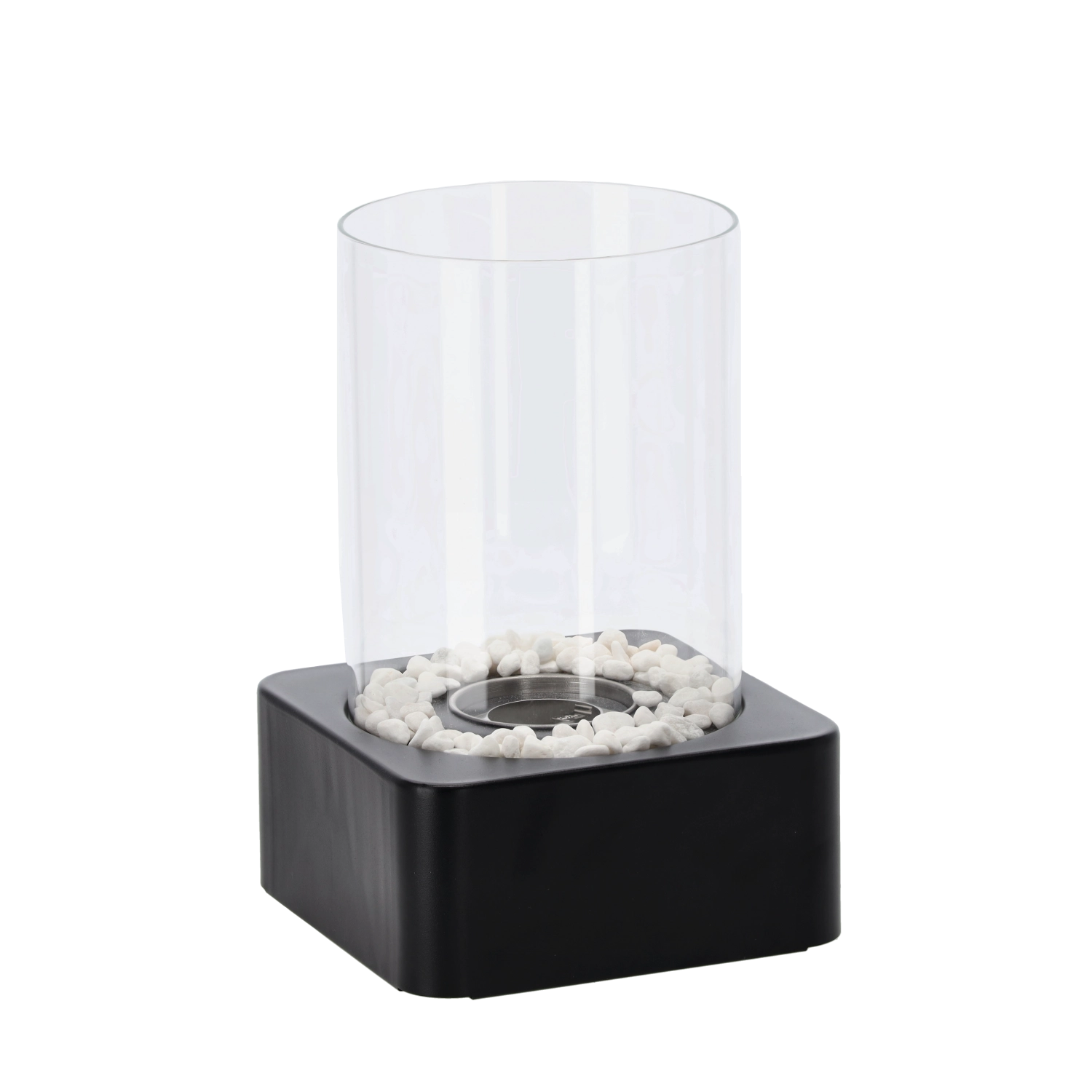 Le cylindre en verre protège la flamme des courants d’air et des contacts, tandis que la base noire robuste avec galets décoratifs assure stabilité et style.