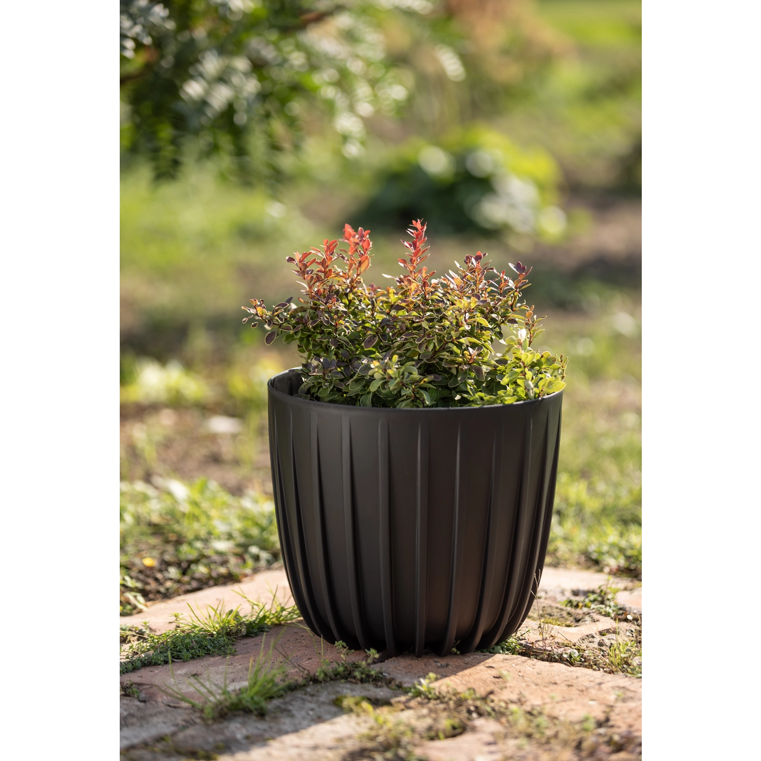 Le cache-pot design Mira en version basse allie look moderne et praticité. Le noir mat avec de fines rainures offre un rendu épuré et intemporel, s’intégrant parfaitement à différents styles d’intérieurs et d’espaces extérieurs. Grâce à l’utilisation de plastique recyclé, il propose une solution écologique et durable pour la culture des plantes.
