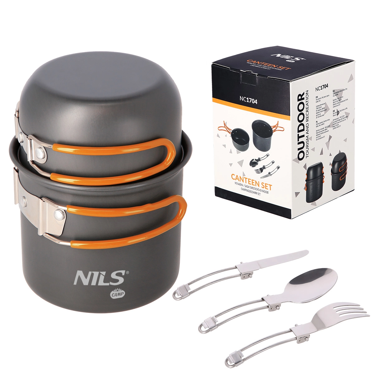 Les couverts pliants (cuillère, fourchette, couteau) avec verrou coulissant contre la fermeture involontaire sont inclus et se rangent après usage dans une pochette pratique à fermeture velcro. La casserole dispose d’une graduation pour un dosage précis et d’un volume utile de 0,8 l, tandis que le poêlon offre 0,35 l – idéal pour faire bouillir rapidement de l’eau, des soupes ou des plats simples sur un réchaud.