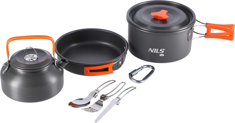 Le set de vaisselle de camping universel NILS Camp est idéal pour la randonnée, le canoë et le camping. Il comprend une casserole avec couvercle, une poêle, une bouilloire et des couverts pliants. Grâce à l’aluminium robuste avec revêtement antiadhésif, la cuisson est simple et rapide, tandis que l’ensemble est léger, résistant et compact. Les poignées rabattables avec isolation thermique augmentent la sécurité et le design compact permet d’emboîter facilement les éléments les uns dans les autres. Inclus sac de transport et mousqueton pour un séchage et un transport pratiques.