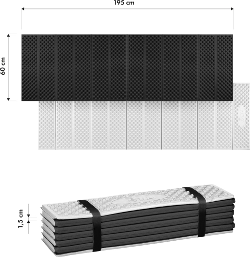 Le pliage en « accordéon » économise de la place dans le sac, et les sangles de maintien gardent le tapis compact pendant le transport. Les dimensions généreuses de 195 × 60 cm et l’épaisseur de 1,5 cm offrent un soutien confortable même aux personnes de grande taille.