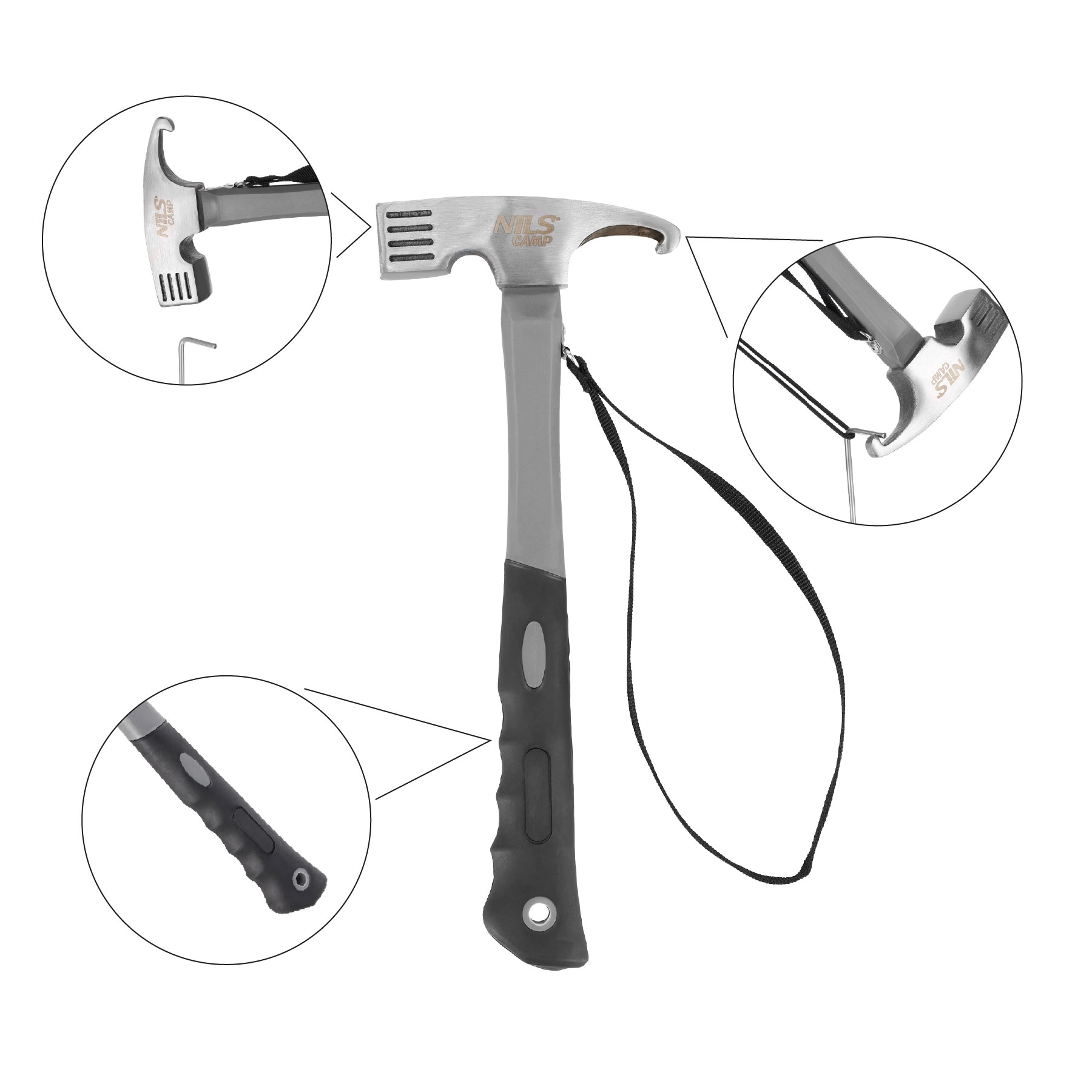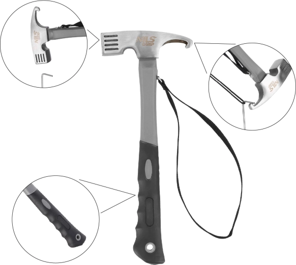 Le marteau de camping pratique NILS Camp est un compagnon fiable pour le montage de la tente et les travaux en extérieur. Il possède une tête en acier durable pour enfoncer les piquets en toute sécurité, une poignée ergonomique antidérapante pour une prise en main confortable et une dragonne pour une manipulation plus sûre. Le crochet intégré pour l’extraction des piquets facilite le démontage de la tente, même dans un sol dur.