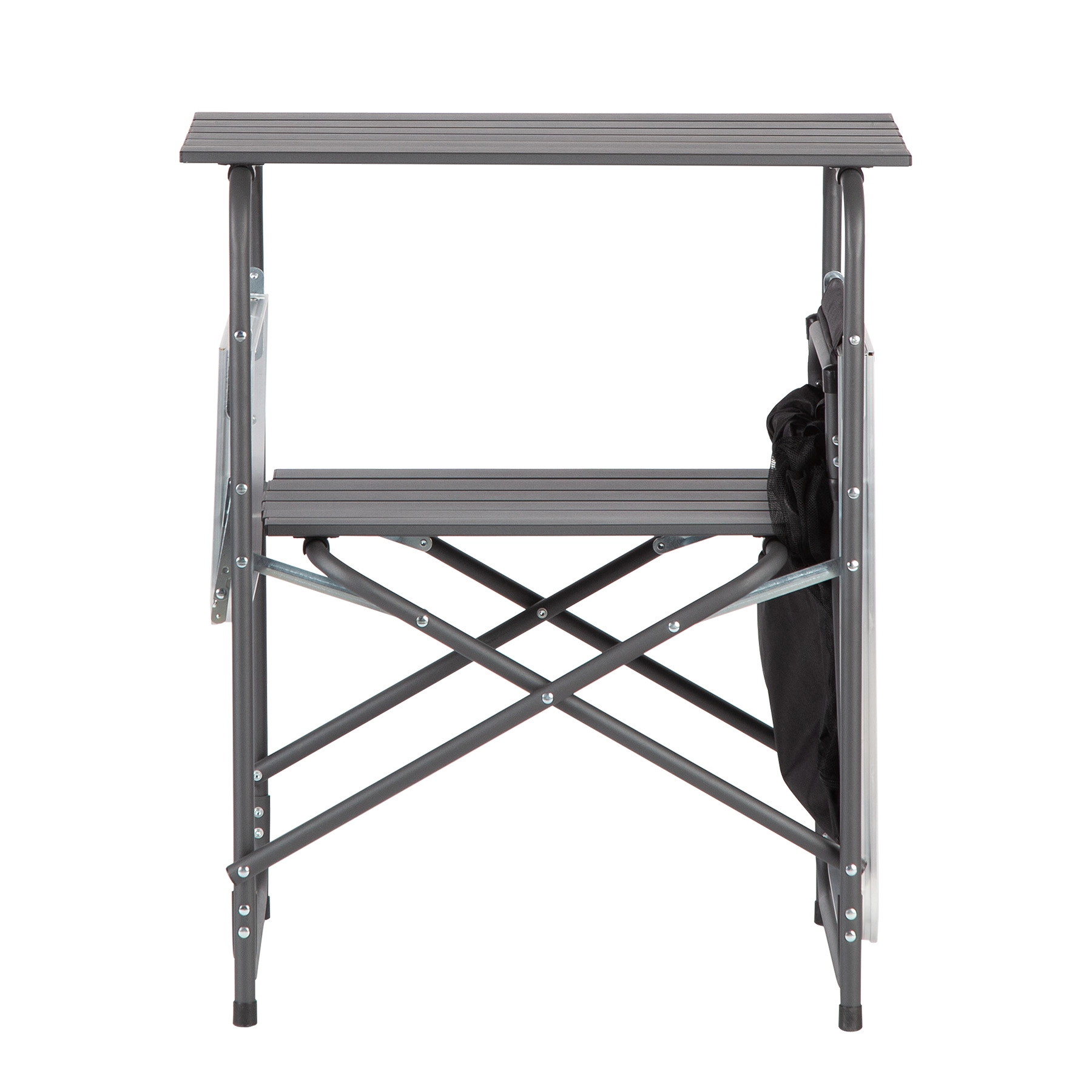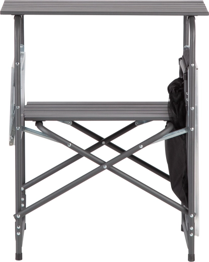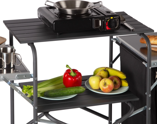 Les deux plans de travail rabattables offrent de l’espace pour la préparation et le service des repas. Lorsque vous devez gagner de la place, il suffit de les rabattre – l’armoire se réduit considérablement et se range facilement dans le sac fourni avec poignée. Les pieds antidérapants assurent la stabilité même sur des surfaces moins régulières.