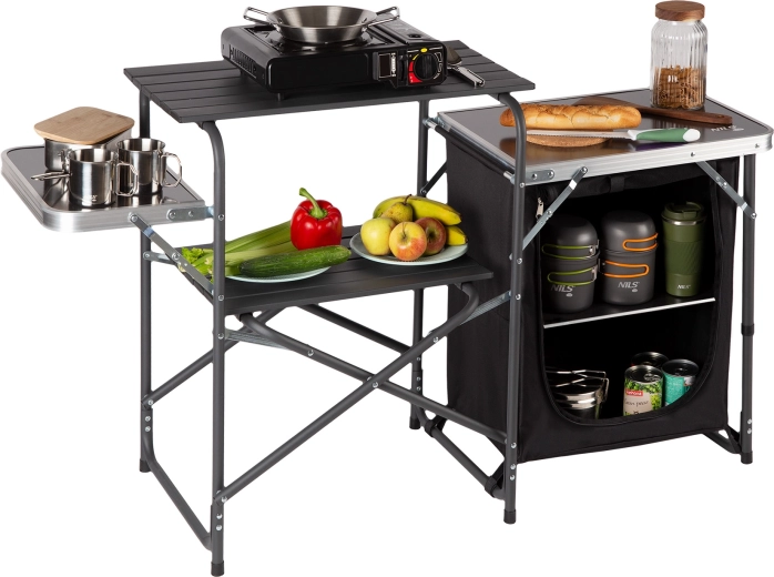 Compacte et stable, l’armoire de camping NILS Camp est une excellente solution pour garder tout à portée de main pendant le camping. Les panneaux latéraux intégrés avec cadre en aluminium résistent aux intempéries et se nettoient facilement, tandis que les étagères spacieuses et le placard zippé maintiennent vos aliments et votre vaisselle bien organisés et en sécurité.
