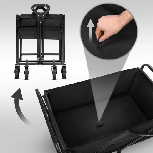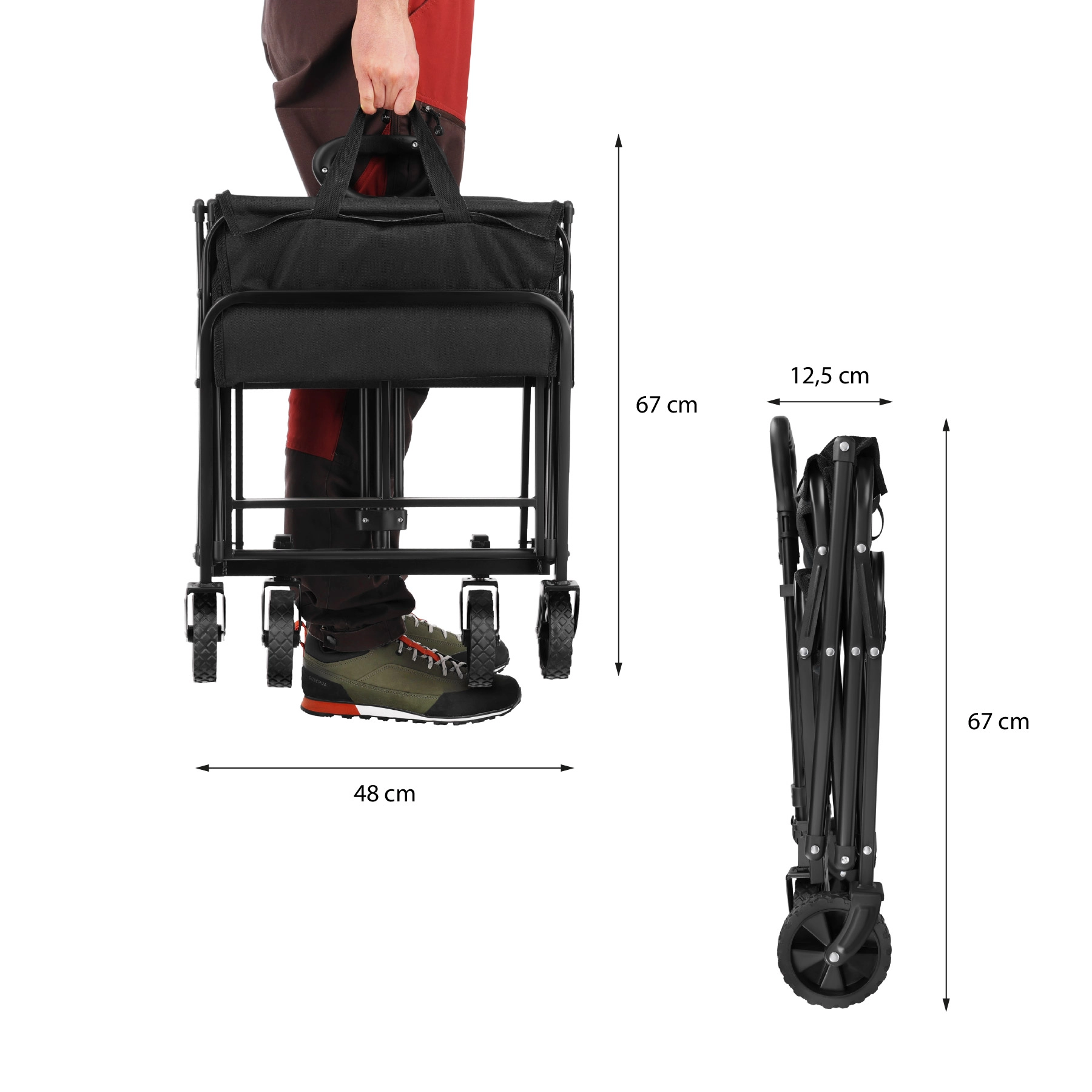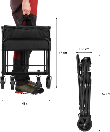 La poignée réglable permet d’adapter la hauteur à votre style de marche, tandis que le cadre en acier avec peinture époxy assure longévité et fiabilité. Le système de pliage rapide prépare le chariot en un instant et, une fois replié, il occupe un minimum d’espace.