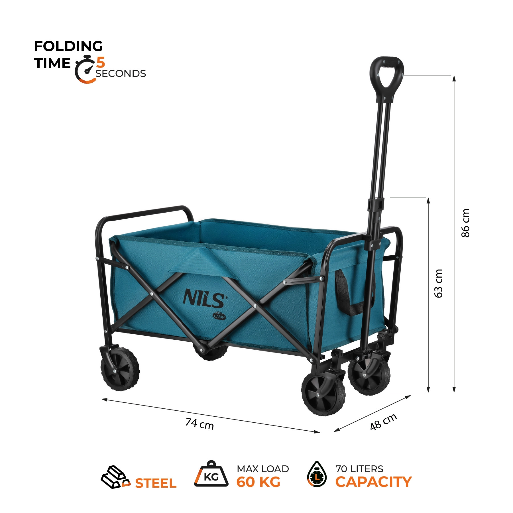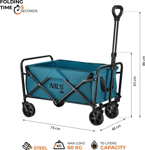 Sa grande capacité de 70 l et sa charge utile de 60 kg permettent d’emporter serviettes, couvertures, équipements de sport, courses et accessoires pour enfants en une seule fois. La poignée réglable s’adapte à votre taille et à votre façon de tirer, pour une manipulation naturelle et confortable même sur de plus longues distances.