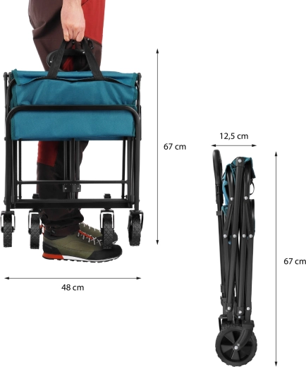 Pratique, ce chariot de camping turquoise est idéal pour la plage, les pique-niques, le camping et les courses du quotidien. Grâce à son système de pliage rapide, il est prêt à l’emploi en un instant et se range facilement dans le coffre de la voiture ou dans un placard après usage. Son cadre en acier solide avec peinture thermolaquée et la toile résistante Oxford 600D avec PVC garantissent une longue durée de vie et la protection de vos affaires transportées.