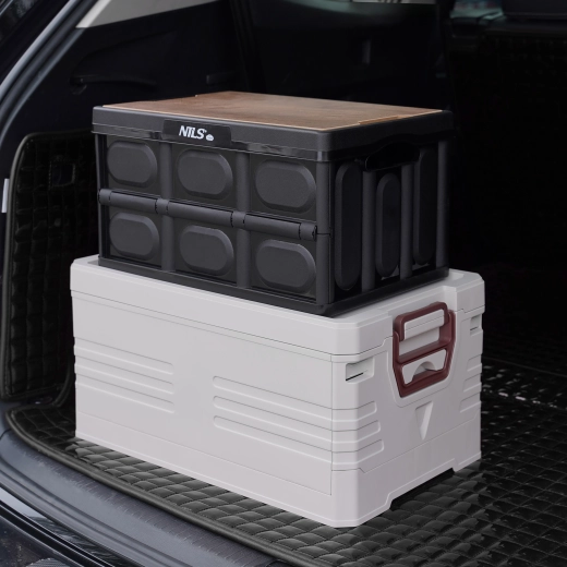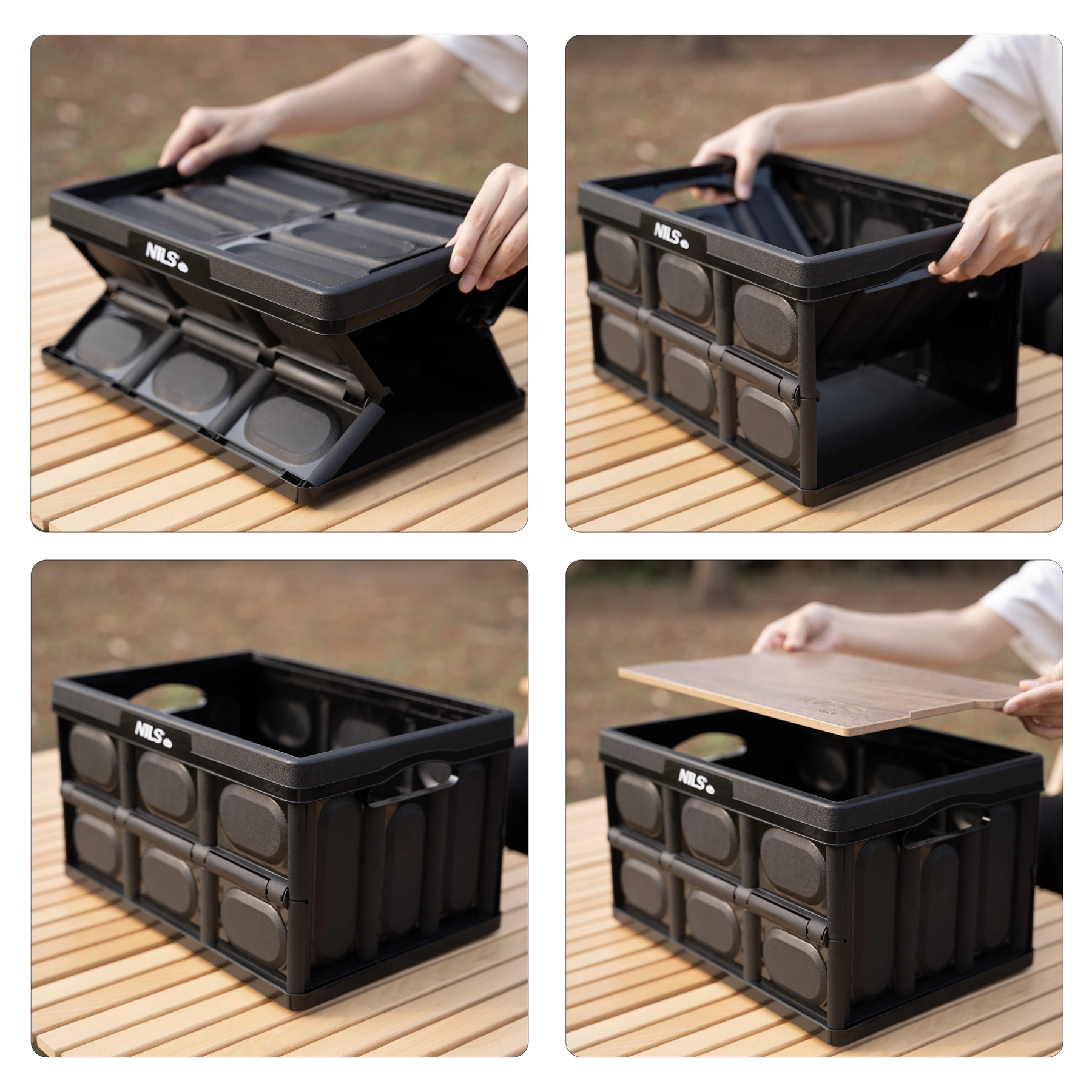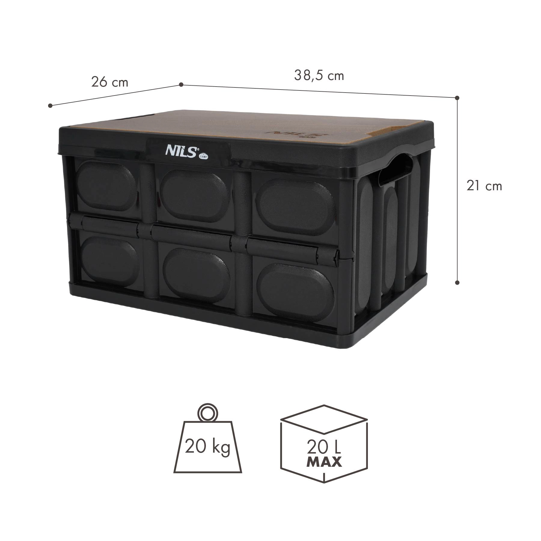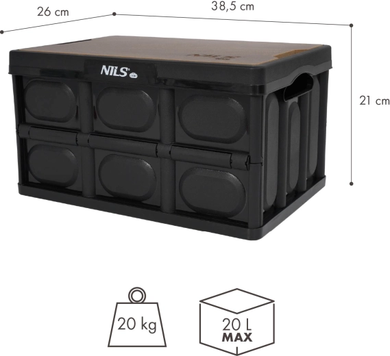 Pratique caisse pliante NILS Camp de 20 l avec couvercle en bois résistant, servant à la fois de boîte de rangement et de table stable. Elle est légère, repliable à 5 cm, empilable et fabriquée en polypropylène résistant, idéale pour la voiture, la maison, le camping et l’atelier.