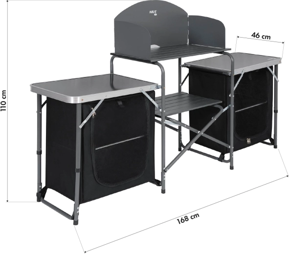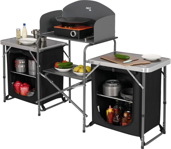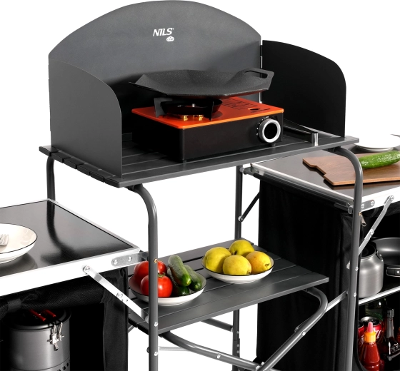 Vous recherchez une solution réfléchie et durable pour cuisiner en extérieur ? L’armoire de cuisine de camping NILS Camp combine ergonomie, ordre et confort dans un ensemble mobile compact. Le plan de travail supérieur en lattes d’aluminium avec pare-vent est idéal pour un réchaud de camping et la préparation des ingrédients, tandis que deux placards en tissu dotés d’étagères rigides en MDF gardent vaisselle et provisions à portée de main et bien rangées.
