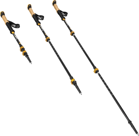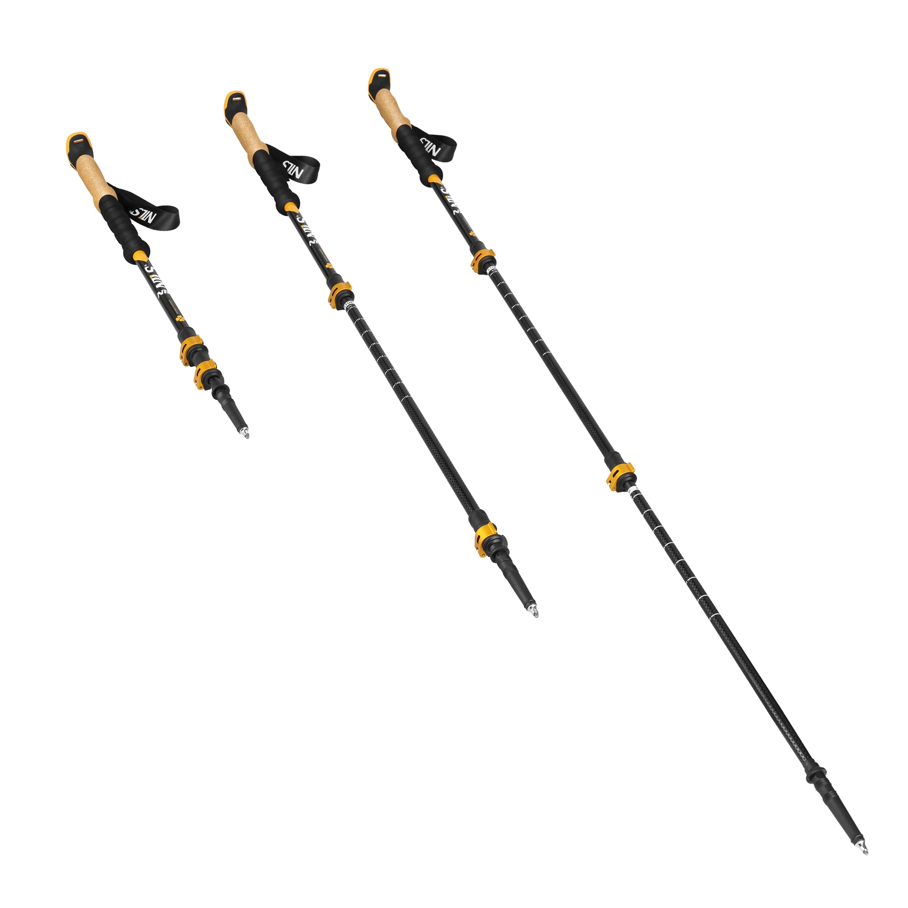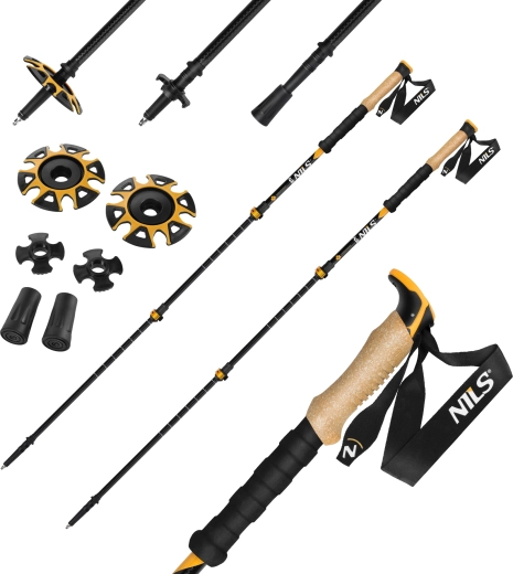 Le modèle NILS TK8605 combine légèreté, solidité et stabilité grâce à l’alliage de qualité aluminium 7075 et à la construction en trois sections. Les poignées ergonomiques en liège naturel et mousse EVA tiennent agréablement en main, amortissent les vibrations et assurent une prise sûre même lors de longues marches.