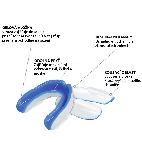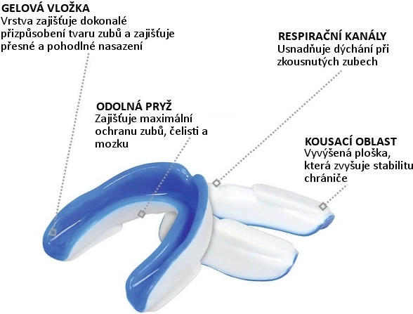 Protège-dents universel pour sports de contact avec construction bi‑couche pour une sécurité et un confort maximaux. La couche interne en gel assure un ajustement confortable, tandis que la gomme externe durcie avec canaux d’air pour une respiration aisée et plaquettes de stabilisation maintient le protège-dents fermement en place lors de l’occlusion.