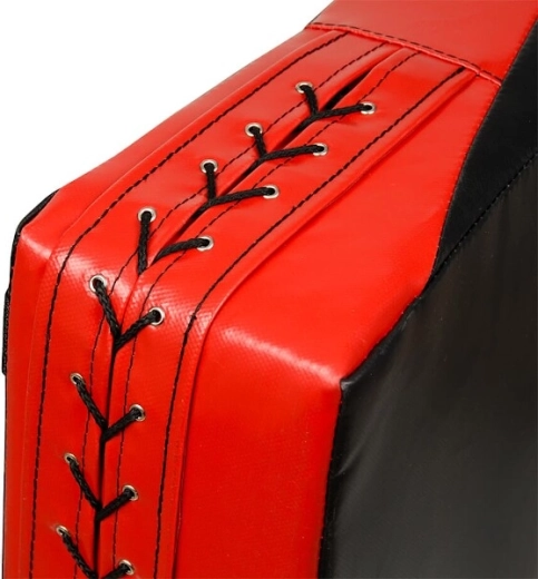 Des orifices de ventilation dissipent la pression de l’air lors des impacts, ce qui réduit le risque de détérioration. À la place d’un zip, un laçage robuste est utilisé pour la solidité et la stabilité de la forme. La courbure ergonomique du bouclier aide à guider les techniques précisément vers le centre et empêche les membres de glisser hors de la cible, augmentant ainsi la sécurité de l’entraîneur.
