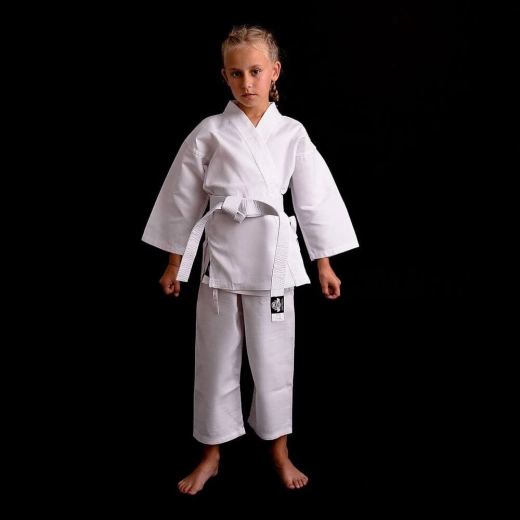 La coupe pratique avec renforts à l’entrejambe et sur les bords de la veste augmente la durabilité lors d’un entraînement régulier. Le pantalon dispose d’un double maintien – élastique et cordon, il ne glisse pas et reste en place même pendant les combinaisons dynamiques. L’ensemble comprend une ceinture blanche permettant aux enfants d’aller s’entraîner immédiatement.