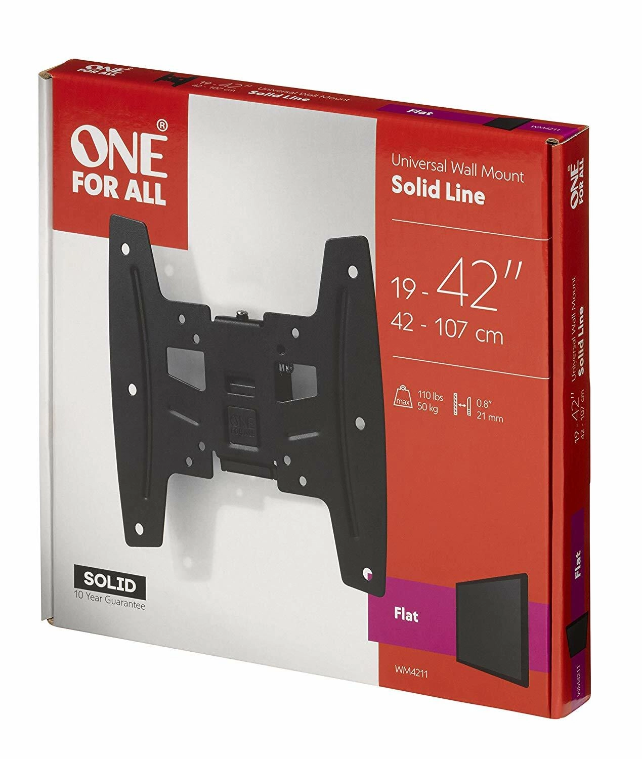Support mural universel ONE FOR ALL WM4211 pour téléviseurs 19–42", offrant une installation ultra fine avec un profil de seulement 21,5 mm. Grâce à la compatibilité VESA 75×75 à 200×200 et à une capacité de charge de 50 kg, il est idéal pour les écrans LED, LCD et plasma et assure une fixation solide et sûre.