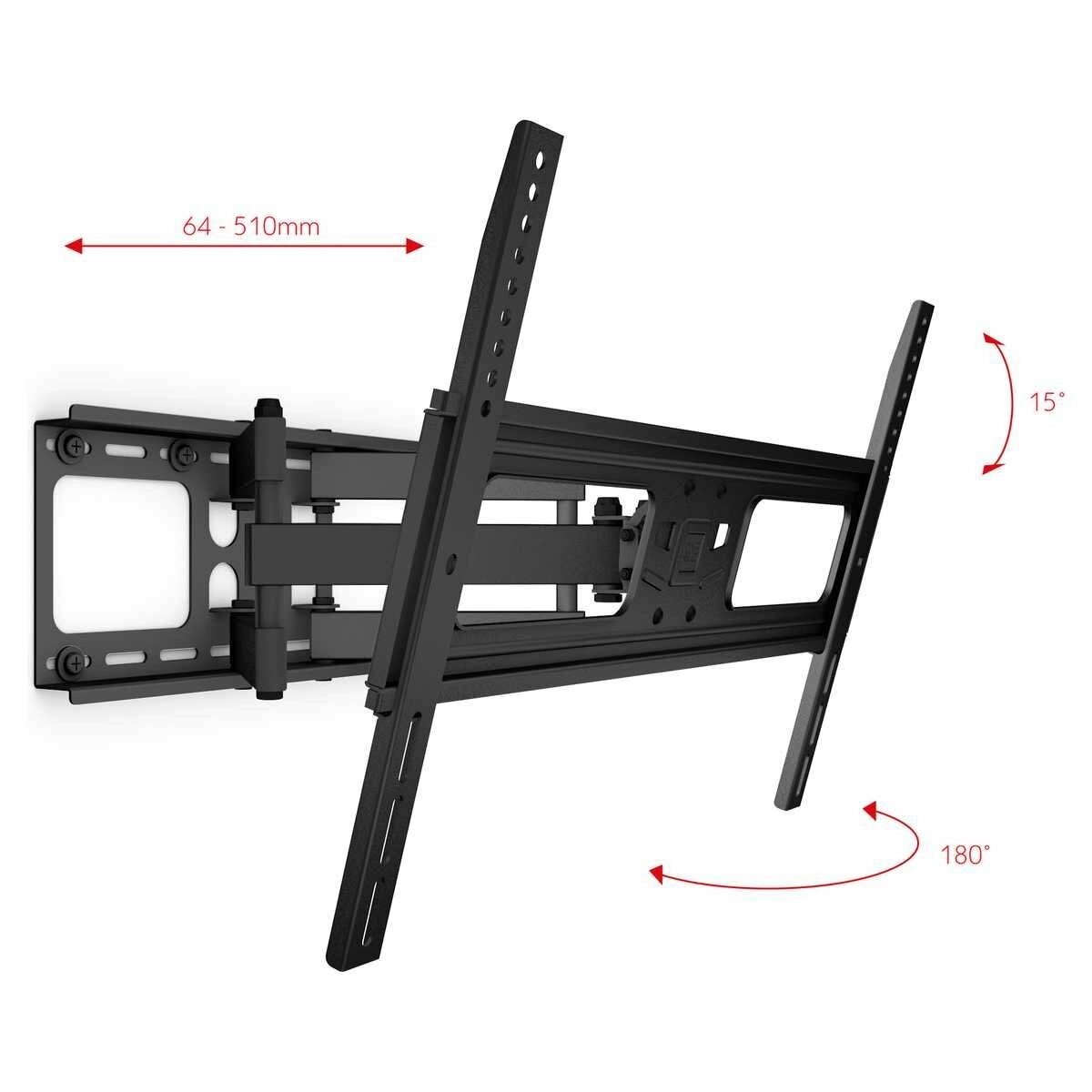 Sa construction robuste avec une capacité de 60 kg convient aux grands écrans de 32 à 84″ et prend en charge les standards VESA 200×200 à 600×400. Le support peut être rapproché du mur à 64 mm pour un look épuré, ou déployé jusqu’à 510 mm pour un pivotement aisé.