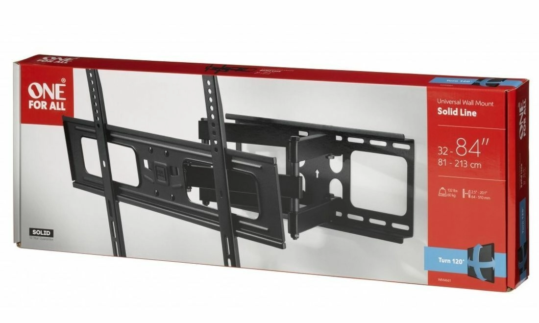 Support mural universel One For All pour téléviseurs 32–84″ offrant un mouvement complet, une rotation jusqu’à 120°, une inclinaison de 20° et une capacité de charge de 60 kg. Sa large compatibilité VESA 200×200 à 600×400 et sa conception intelligente permettent une distance minimale au mur de 64 mm et une extension jusqu’à 510 mm pour un angle de vision idéal.