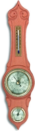 Élégante station météo analogique TFA murale en bois de cerisier massif, combinant baromètre, thermomètre et hygromètre en un ensemble raffiné. Elle séduit par ses cerclages dorés, sa finition soignée et ses cadrans lisibles pour une lecture facile des valeurs.
