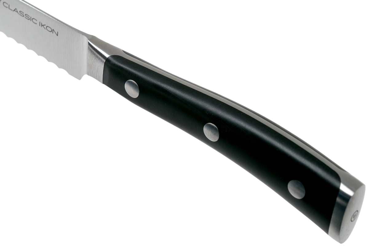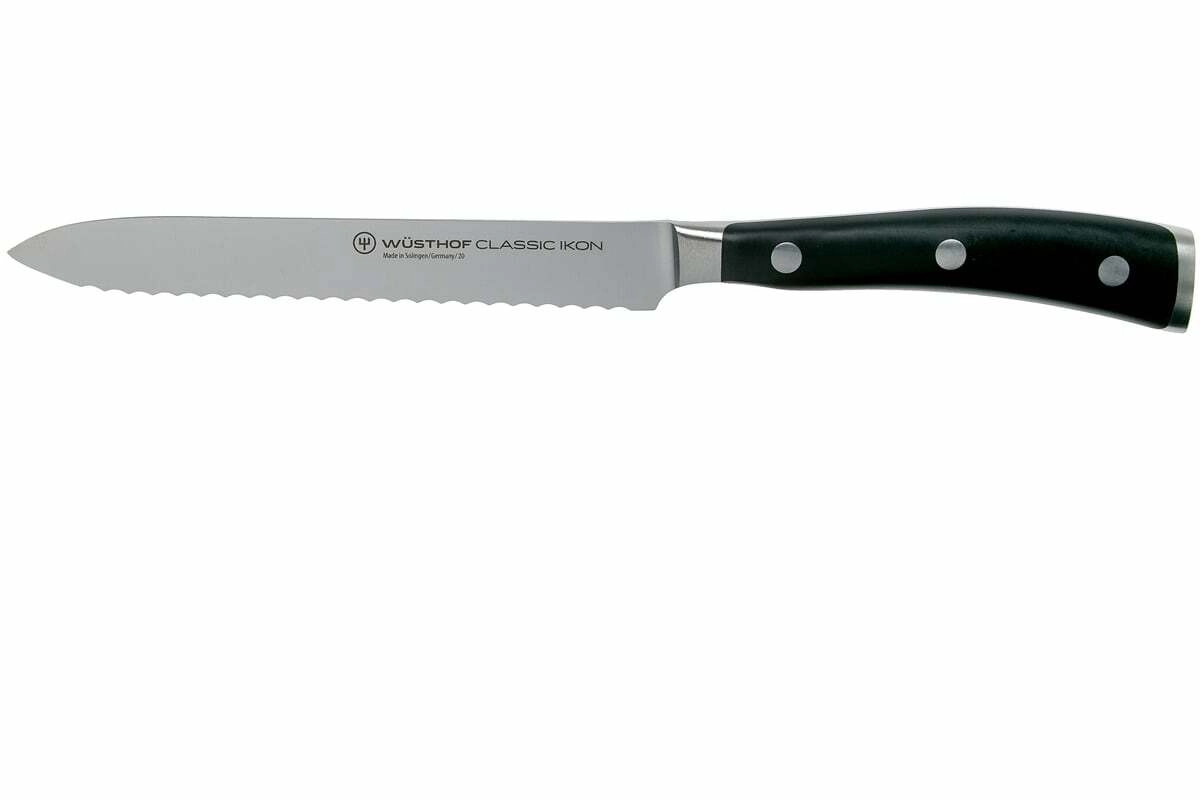 Le couteau universel dentelé Wüsthof CLASSIC IKON de 14 cm est l’outil vers lequel vous vous tournerez chaque jour. Sa lame dentelée mord avec assurance dans les surfaces plus dures et traverse sans effort la croûte croustillante d’une baguette, la peau d’une tomate ou la chair juteuse d’un melon. Grâce à sa construction équilibrée avec soie pleine, vous gardez un contrôle optimal de la coupe.