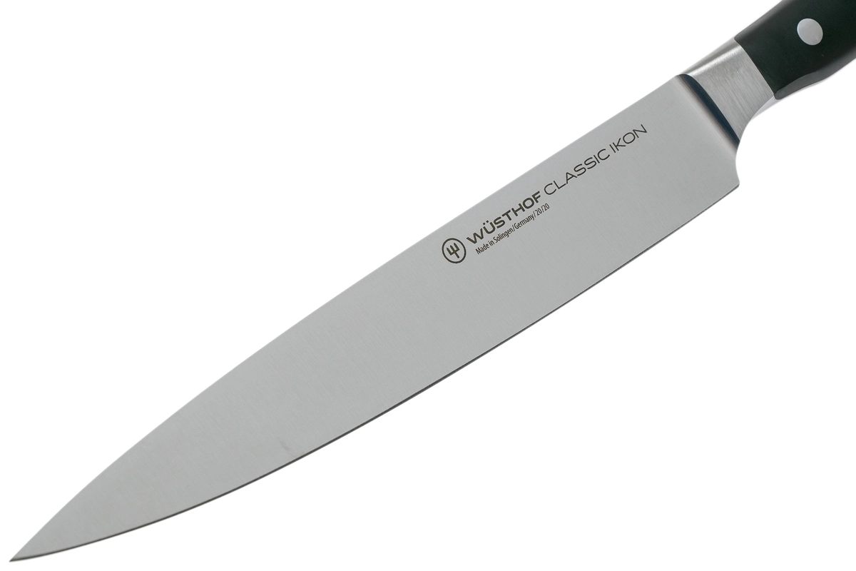 Le couteau à jambon WÜSTHOF Classic Ikon (20 cm) est un aide polyvalent pour trancher avec précision le jambon, la viande ainsi que de gros morceaux de fruits et de légumes. La lame en acier inoxydable de qualité X50CrMoV15 conserve longtemps son tranchant et, grâce à sa géométrie bien pensée, traverse facilement les aliments sans les déchirer.