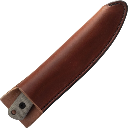 Le manche texturé en Micarta de couleur grise assure une prise ferme même mouillée. La construction full tang augmente la solidité, la garde marquée protège la main contre le glissement et l’œillet pour cordon facilite la sécurisation du couteau. L’emballage comprend un étui en cuir de qualité avec passant de ceinture pour un port sûr et confortable.