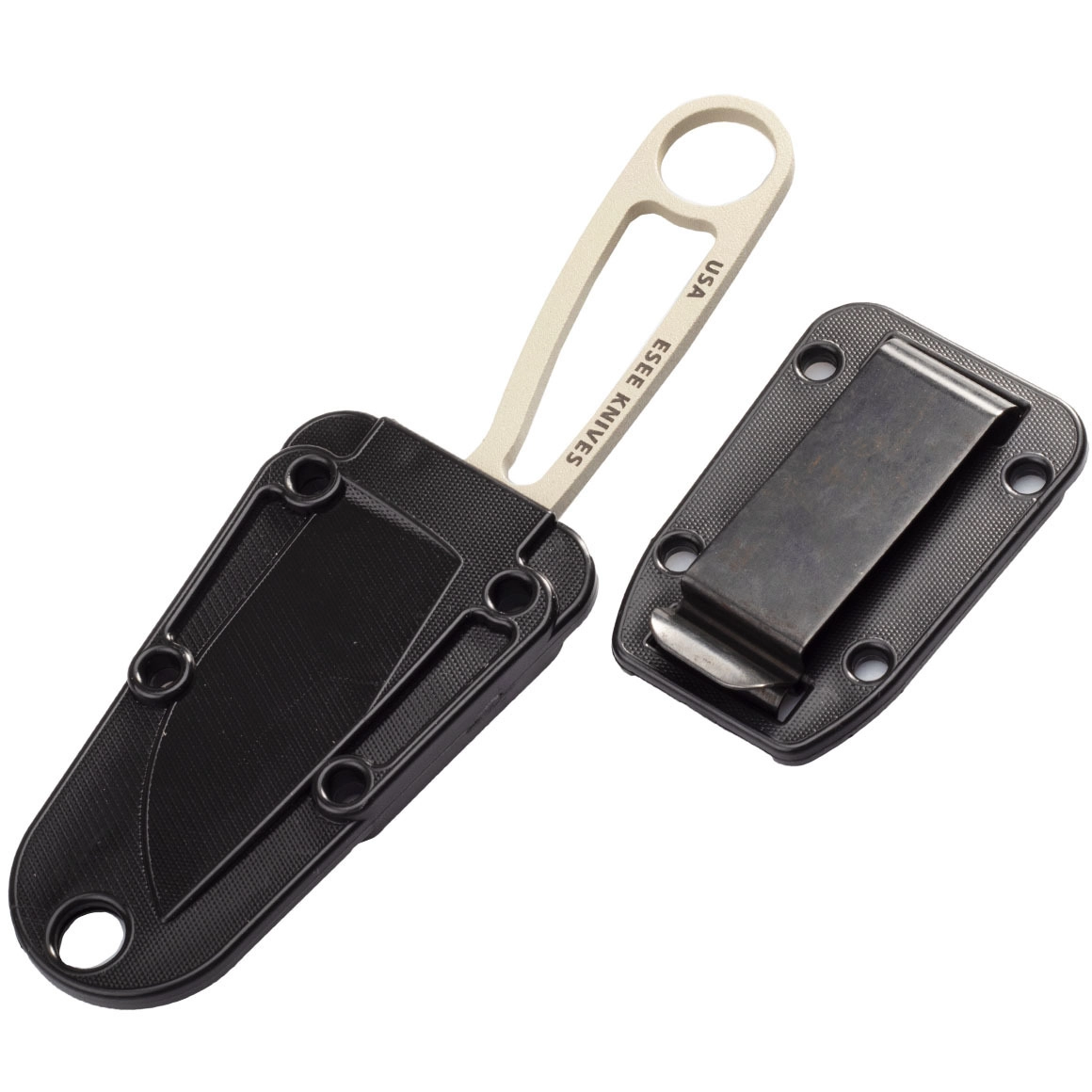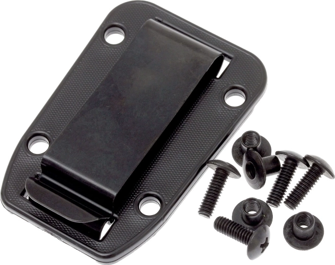 L’étui plastique noir muni d’une pince métallique maintient fermement le couteau en place et permet plusieurs options de port pour un accès rapide.