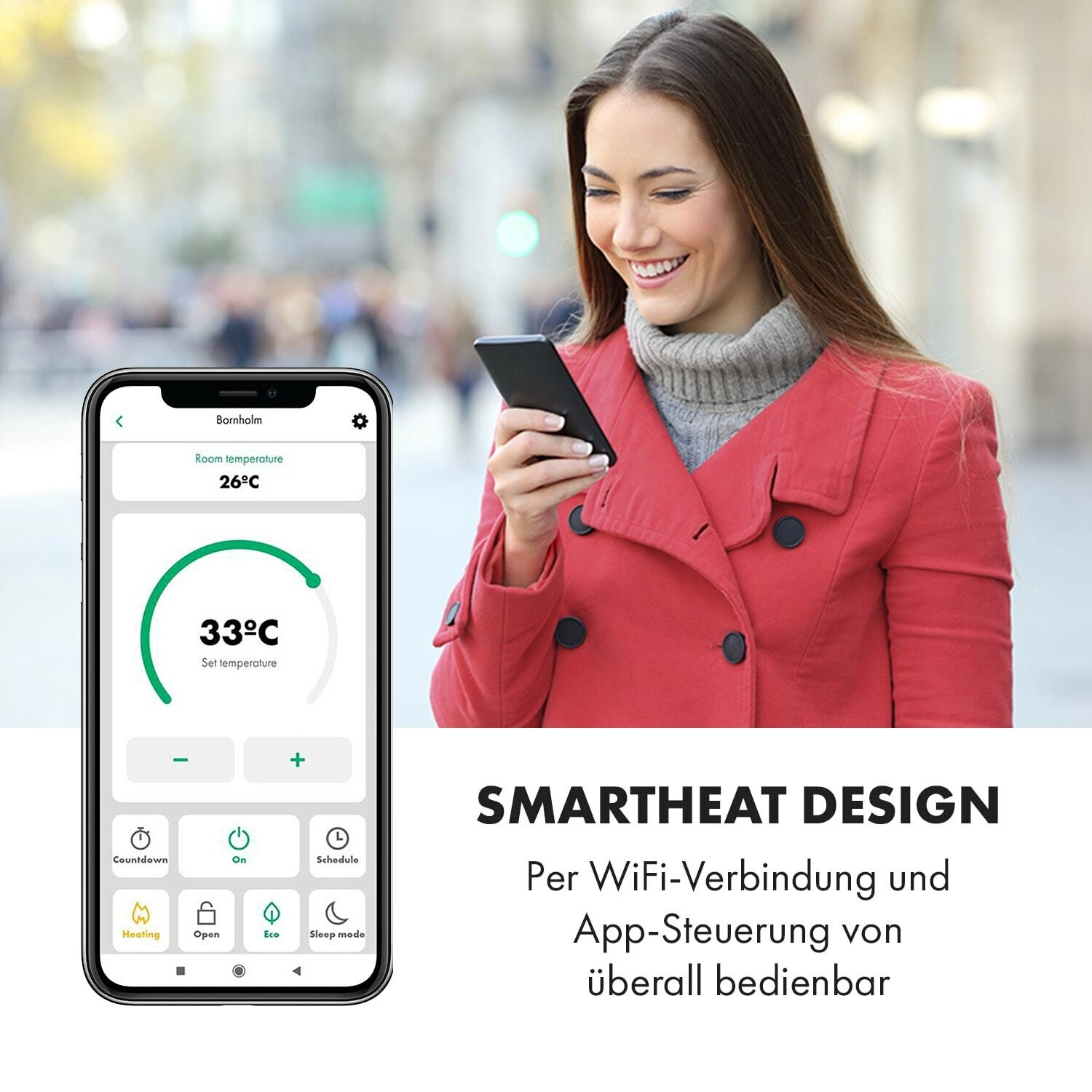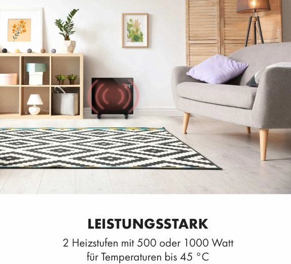Des fonctions intelligentes pour plus de confort : via le Wi‑Fi et l’application Klarstein App, réglez tout à distance, ou utilisez le panneau LED tactile ou la télécommande. Le programmateur hebdomadaire permet de planifier le chauffage pour chaque jour. Le panneau en verre avec indice de protection IP24 résiste aux éclaboussures, idéal également pour la salle de bain.