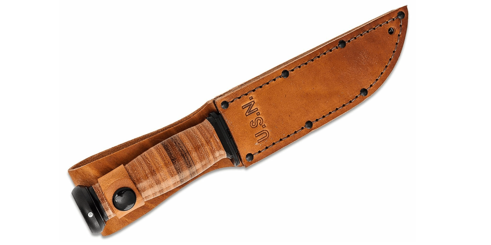 La lame en acier 1095 Cro‑Van avec finition noire résiste à la corrosion et réduit les reflets, tandis que le manche en cuir stratifié tient parfaitement en main et assure une prise sûre même avec des gants. L’emballage comprend un étui en cuir de qualité pour un port sécurisé et un accès rapide.