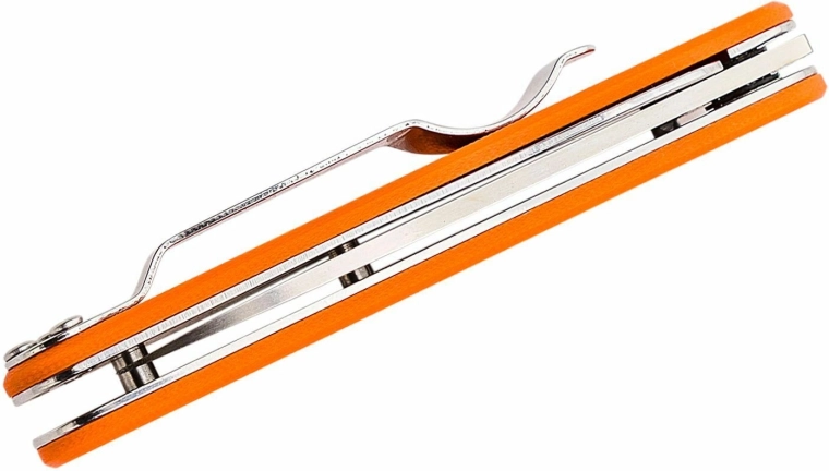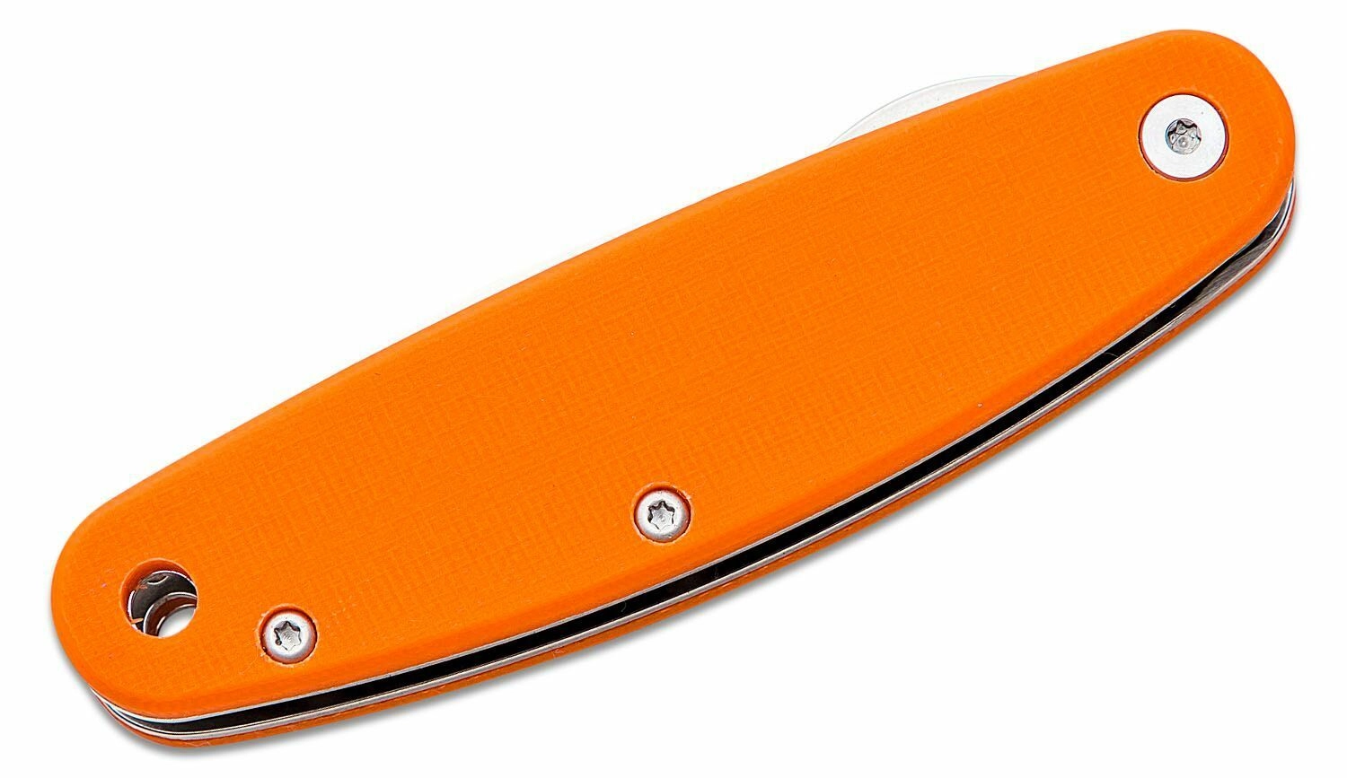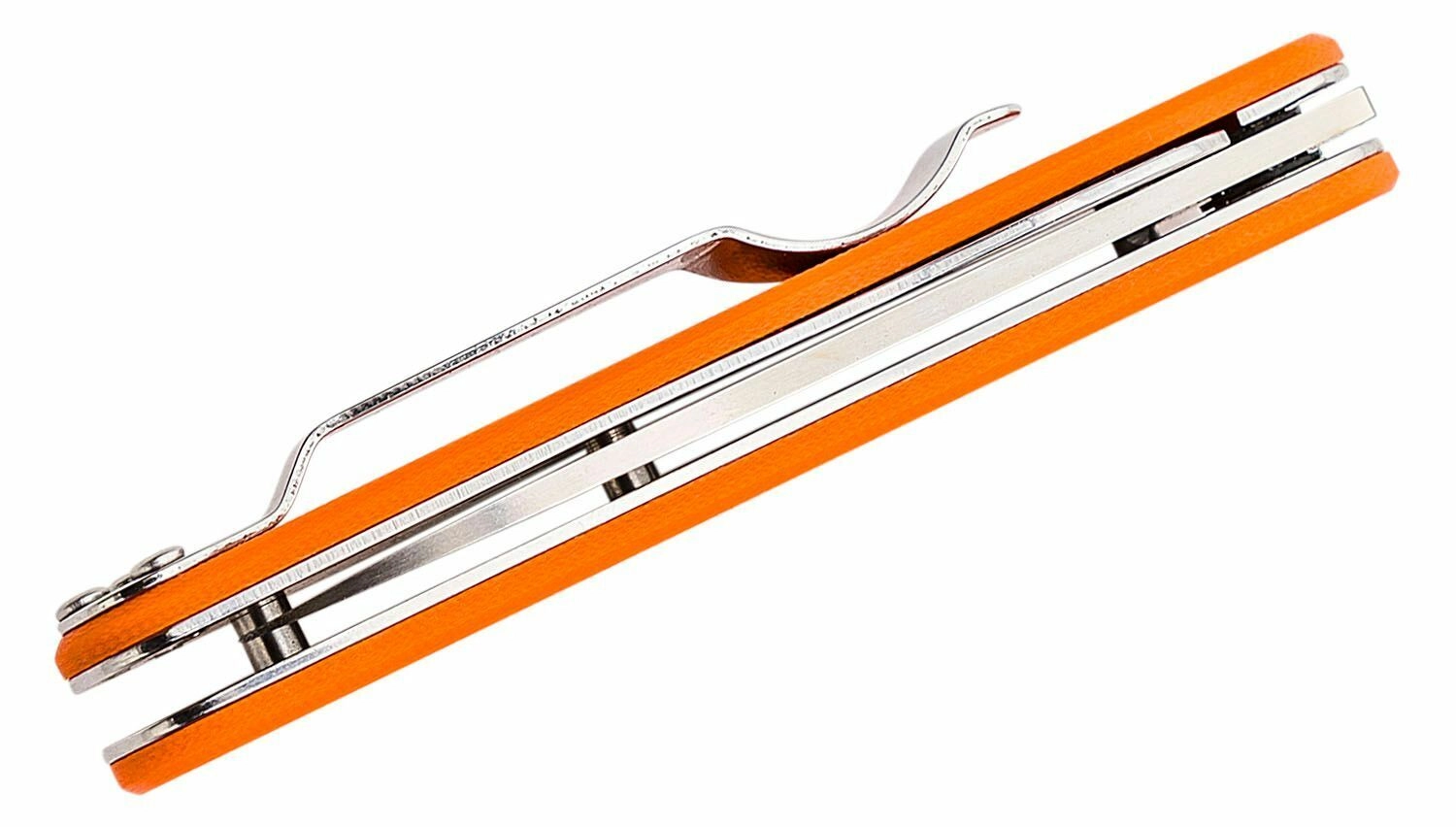 Plaquettes G10 orange avec inserts métalliques offrant une prise ferme et une grande résistance pour une utilisation quotidienne.