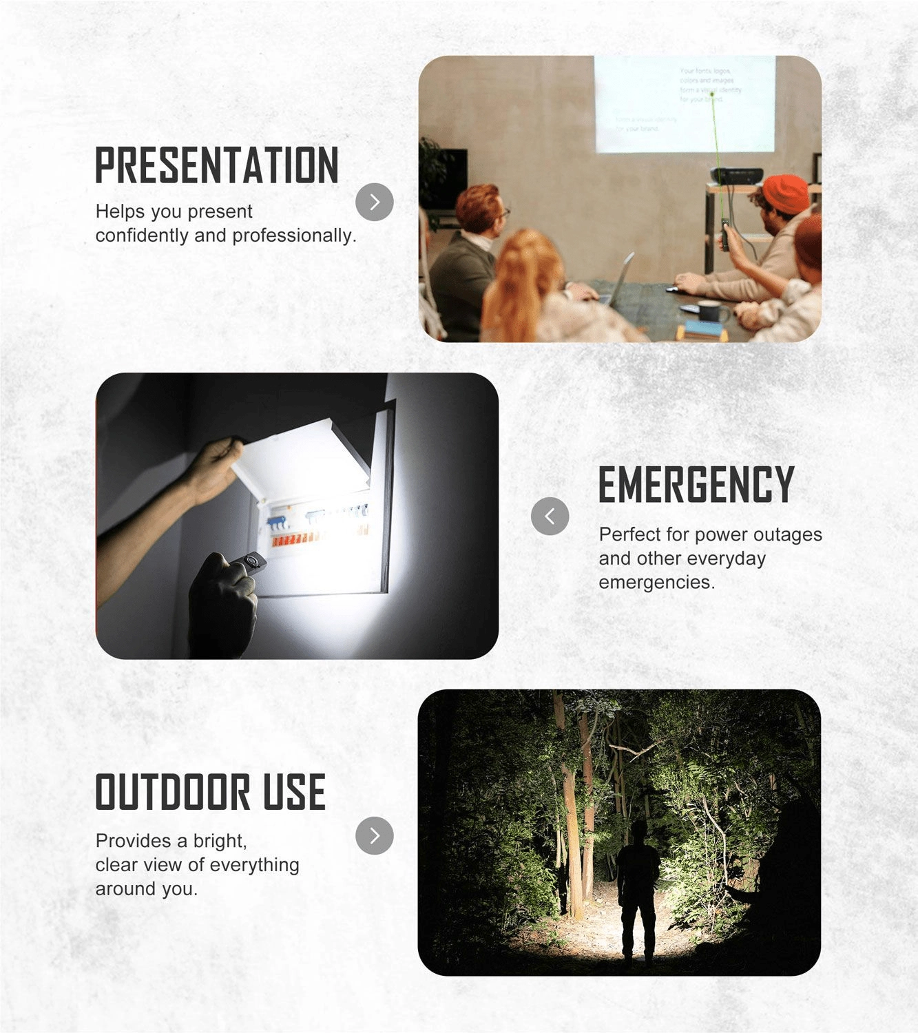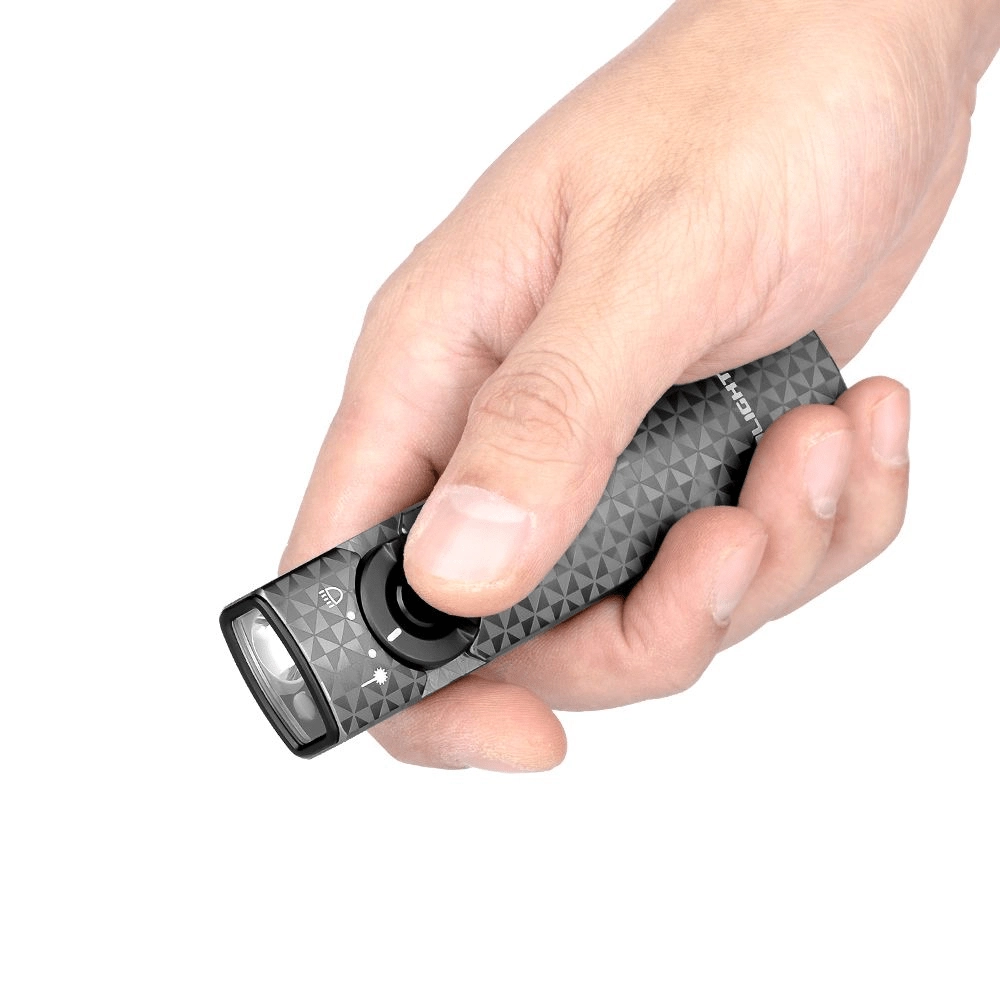 Un corps élégant et plat avec texture métallique et clip en acier assure une prise en main sûre, un port aisé en poche et une fixation rapide à la ceinture. Un flux lumineux maximal de 1 000 lumens et une portée jusqu’à 101 mètres offrent un éclairage fiable en ville, à l’atelier comme en plein air. Le laser vert intégré est utile pour les présentations et pour jouer avec les animaux de compagnie.