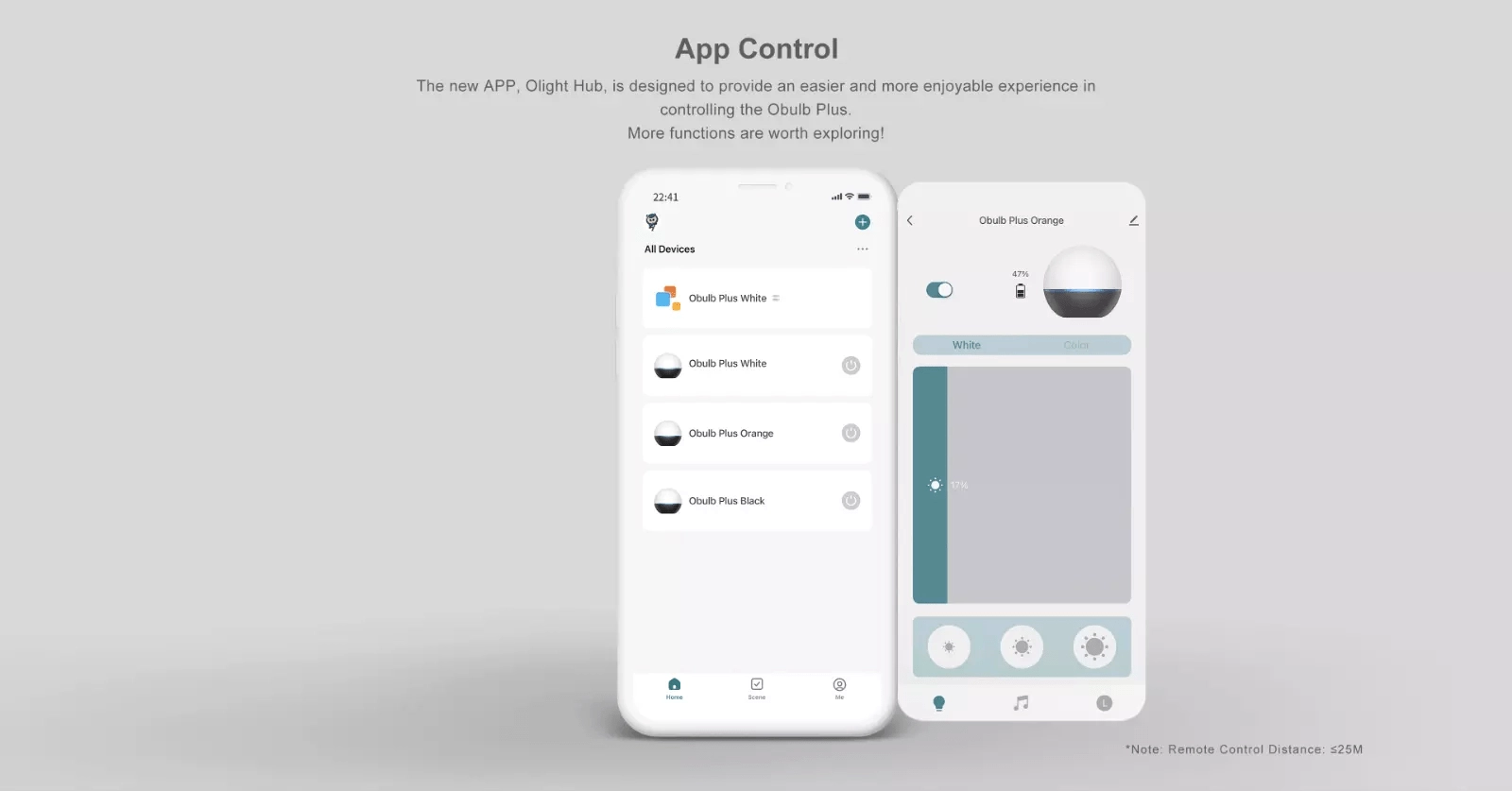Via Bluetooth dans l’application OLIGHT, réglez facilement la couleur, la luminosité, les scènes et suivez l’état de la batterie. Contrôle de groupe, modes musicaux, rythme et minuteur sont également disponibles.