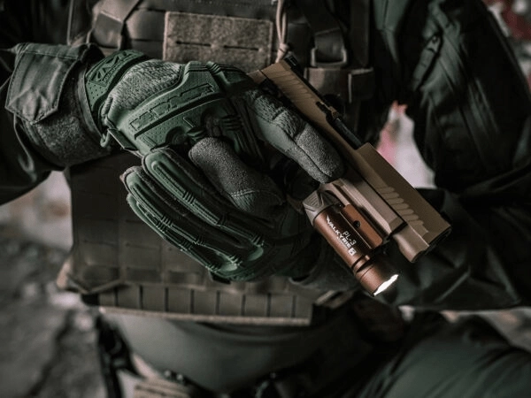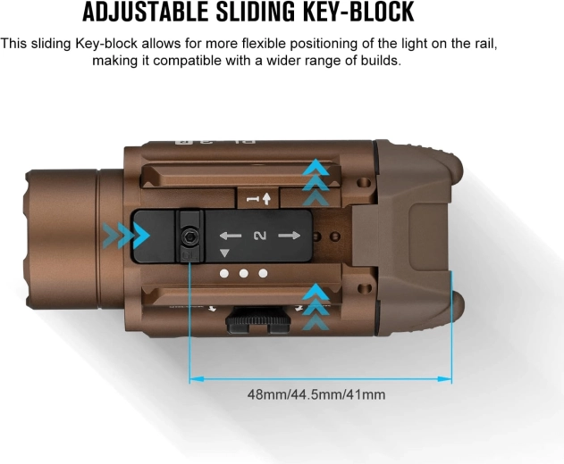 La fixation sécurisée est assurée par un mécanisme de verrouillage à vis, compatible avec les rails Picatinny 1913 et Glock (GL). La lampe supporte un usage tactique dans des conditions exigeantes grâce à sa construction robuste en aluminium (6061‑T6) avec anodisation dure de type III, une résistance aux chocs de 1 m et une protection IPX6. La gestion active de la température réduit automatiquement la puissance pour protéger la LED contre la surchauffe.