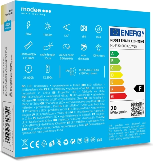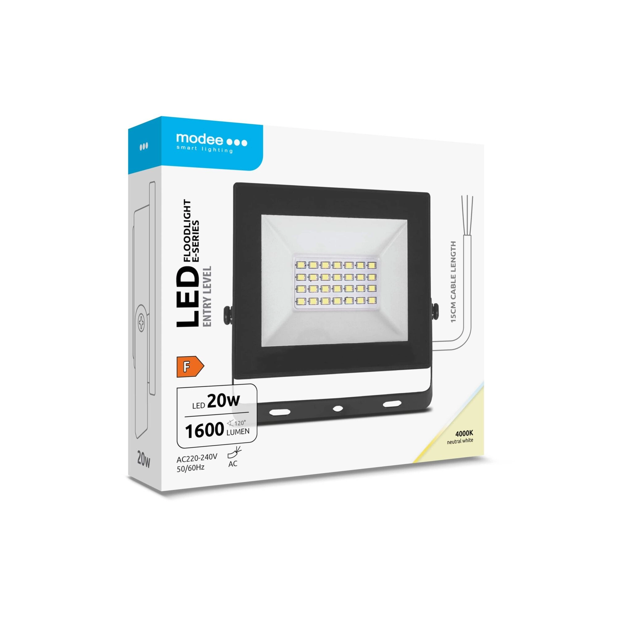 Projecteur LED compact MODEE E‑series Slim offrant 1600 lm lumineux pour une puissance de 20 W, une lumière blanche neutre 4000 K agréable et un large angle de faisceau de 120°. Grâce à l’indice de protection IP65, il résiste à la poussière et aux jets d’eau, idéal pour éclairer allées, jardins, terrasses ou cours. Son câble d’installation de 15 cm facilite le montage.