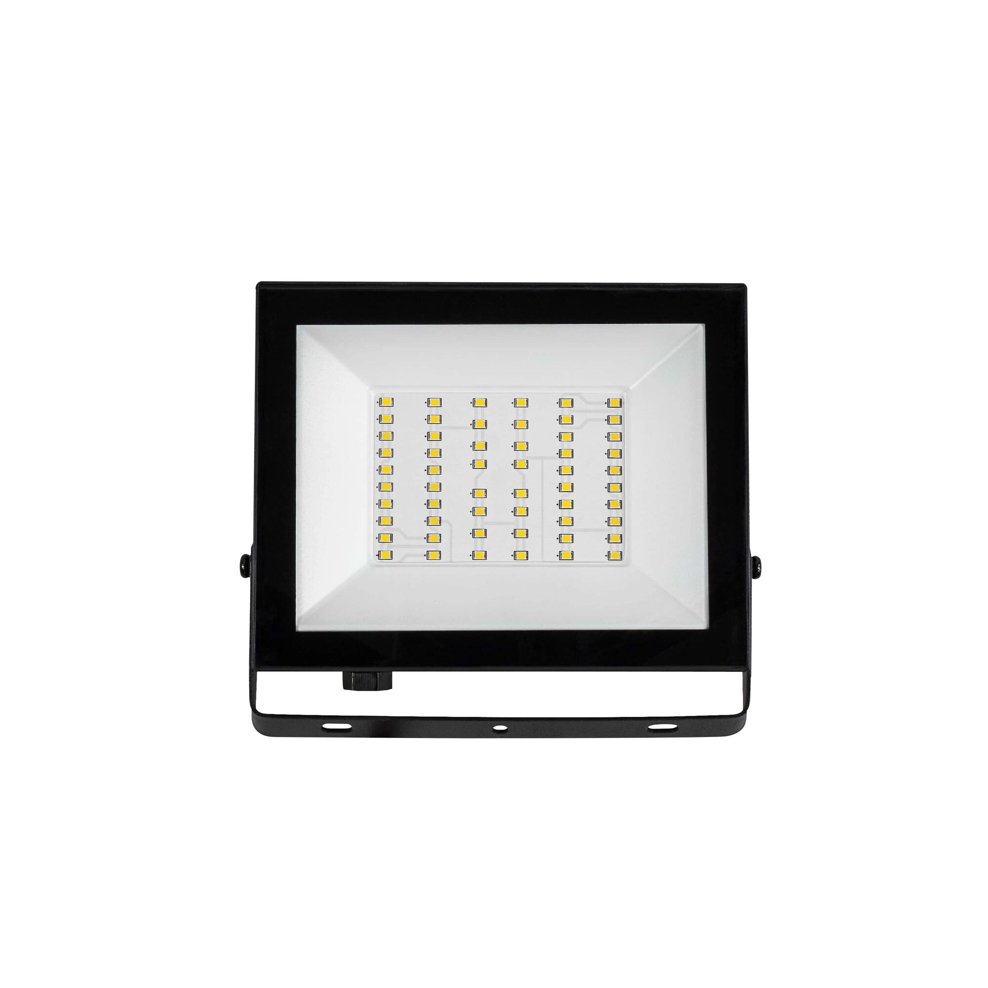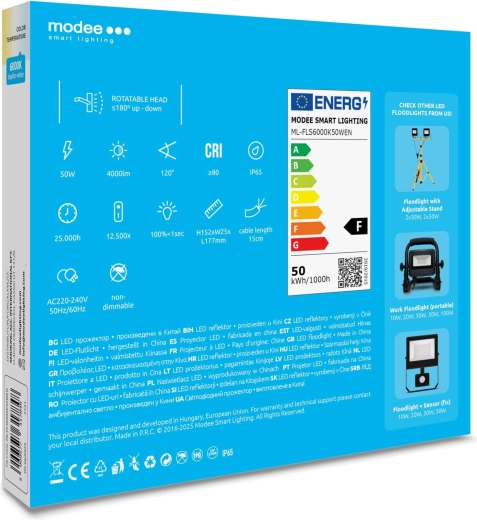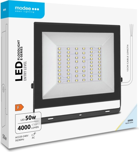 Puissant projecteur LED extérieur MODEE E‑series Slim offrant une lumière blanche du jour 6000 K et jusqu’à 4000 lm pour seulement 50 W. Grâce à son large angle de diffusion de 120°, à son indice de protection IP65 et à son design compact et fin, il est idéal pour éclairer allées, cours, jardins, terrasses ou entrepôts. Inclus : câble d’alimentation de 15 cm pour une installation facile.