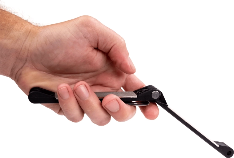 La plaque diamantée 400 grit, plus agressive, restaure rapidement le fil, tandis que la céramique fine le lisse et le polit pour une coupe nette et précise – le tout dans un outil de poche.