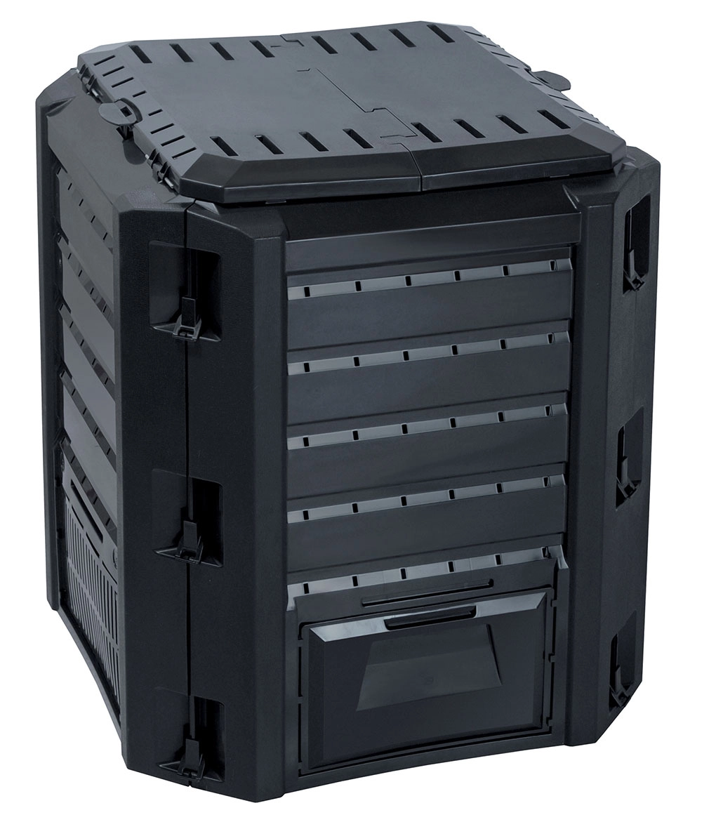Le couvercle supérieur permet d’ajouter rapidement des matières, et la trappe de service inférieure facilite le prélèvement du compost prêt à l’emploi pour la fertilisation des massifs, pelouses et arbustes. Le composteur possède des verrous solides et une structure à panneaux pour un montage rapide et une excellente stabilité. Sa finition noire élégante se fond discrètement dans la verdure environnante.