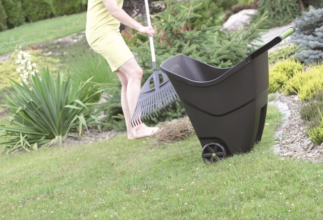 La cuve en plastique robuste et les roues durables assurent une bonne stabilité, même sur terrain irrégulier. La couleur olive s’intègre naturellement au jardin et la surface de qualité est facile à entretenir – il suffit de rincer à l’eau.