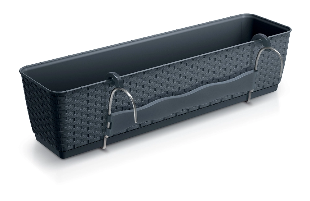 Élégante jardinière avec crochets RATOLLA en couleur anthracite, offrant un look rotin stylé, une suspension facile sur appui de fenêtre ou clôture, et un plastique résistant pour une utilisation en intérieur comme en extérieur. La soucoupe solidement fixée intégrée facilite l’arrosage et favorise la croissance saine des plantes.