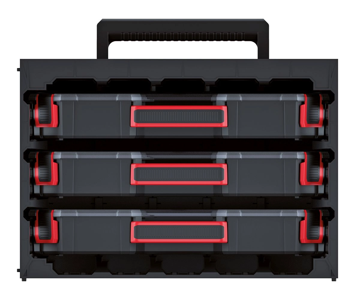 Cette armoire compacte avec 3 organiseurs TAGER CASE offre une solution intelligente pour ranger vis, chevilles, embouts, connecteurs électriques et autres accessoires. Grâce aux trois organiseurs amovibles, tout reste à sa place et toujours à portée de main. Les couvercles transparents permettent un contrôle visuel rapide du contenu sans ouverture, tandis que les loquets robustes maintiennent l’ensemble en sécurité pendant le transport.