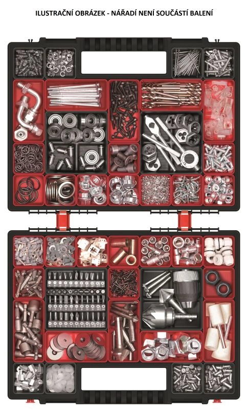Le couvercle transparent en polypropylène résistant fait gagner du temps – un coup d’œil suffit pour contrôler le contenu. Les verrous solides empêchent toute ouverture involontaire pendant le transport et la poignée ergonomique améliore le confort de travail à l’atelier, sur le chantier ou dans le garage. Les dimensions compactes facilitent le rangement sur une étagère, dans une armoire ou dans un véhicule de service.
