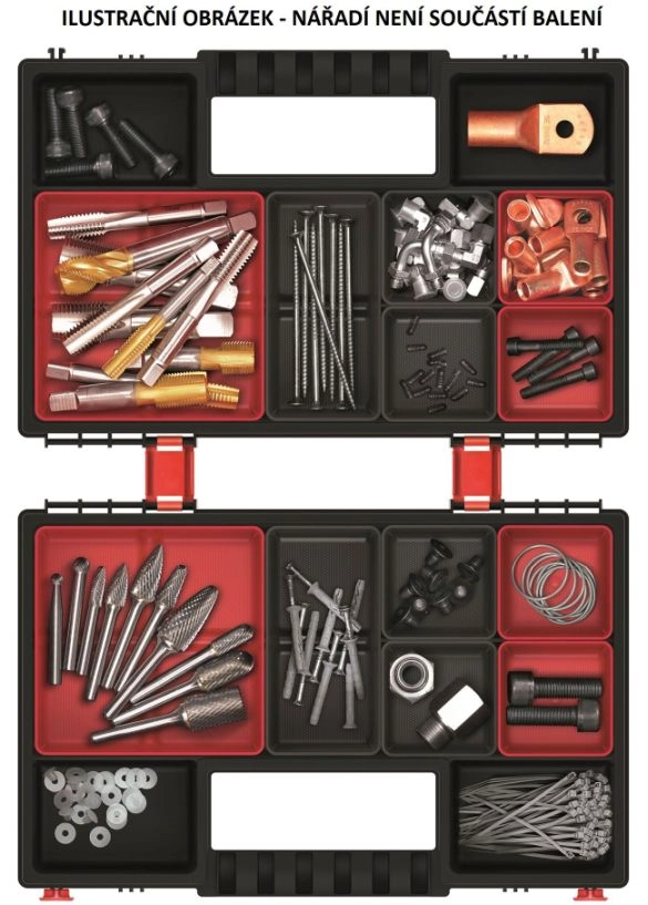 Chaque organiseur contient 6 compartiments amovibles que vous pouvez disposer selon vos besoins. Les verrous robustes et la poignée ergonomique offrent une prise sûre et un transport sécurisé, tandis que le corps résistant en mélange polymère supporte une utilisation quotidienne à l’atelier comme sur le chantier.