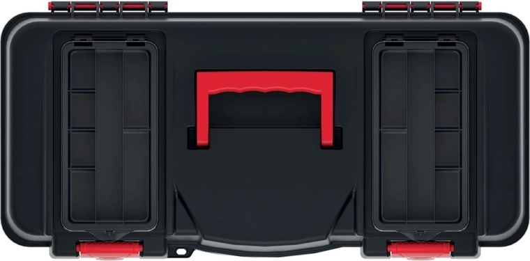 L’agencement intérieur astucieux comprend un plateau amovible pour les outils fréquemment utilisés et un compartiment principal spacieux pour l’équipement plus volumineux. Deux organiseurs supérieurs avec couvercles transparents permettent un accès rapide aux petites fixations, vis ou embouts sans devoir ouvrir toute la mallette.