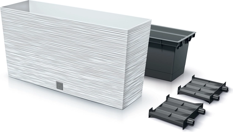 Élégante jardinière Furu M de 77 cm de longueur, en blanc raffiné, idéale pour balcon, terrasse et intérieur. Sa surface rainurée offre un look moderne et une meilleure stabilité. Le plastique résistant avec protection UV assure une longue durée de vie, tandis que la cuvette intérieure facilite la plantation et l’entretien.