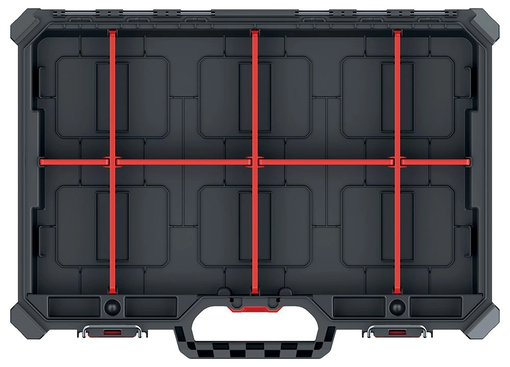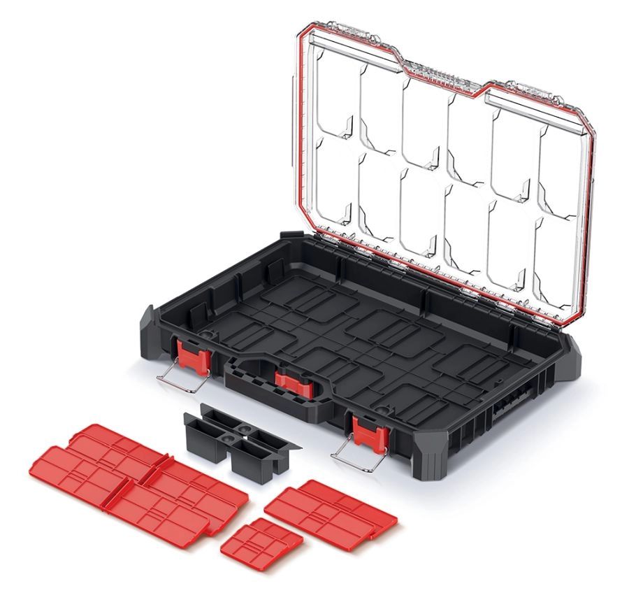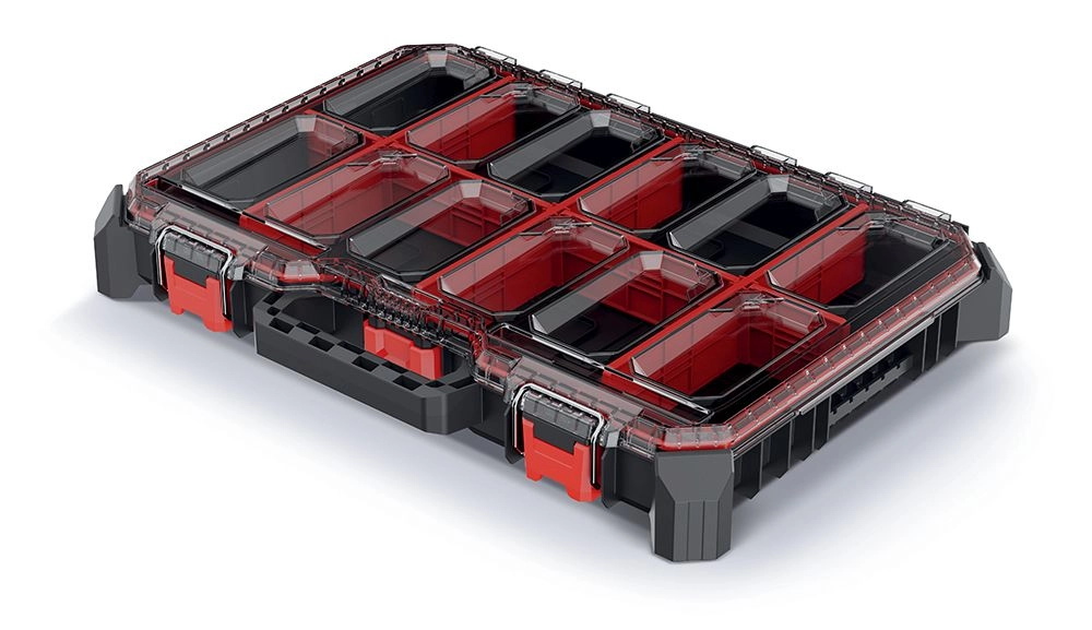 Organiseur résistant pour outils et éléments de fixation avec profil bas pour un rangement facile. Il offre un couvercle transparent en polycarbonate pour une vue rapide, un joint robuste contre la poussière et l’humidité, et des charnières métalliques avec loquets en ABS pour une fermeture sûre. Grâce à 2 boîtes amovibles et 7 séparateurs, vous personnalisez l’espace intérieur selon vos besoins.