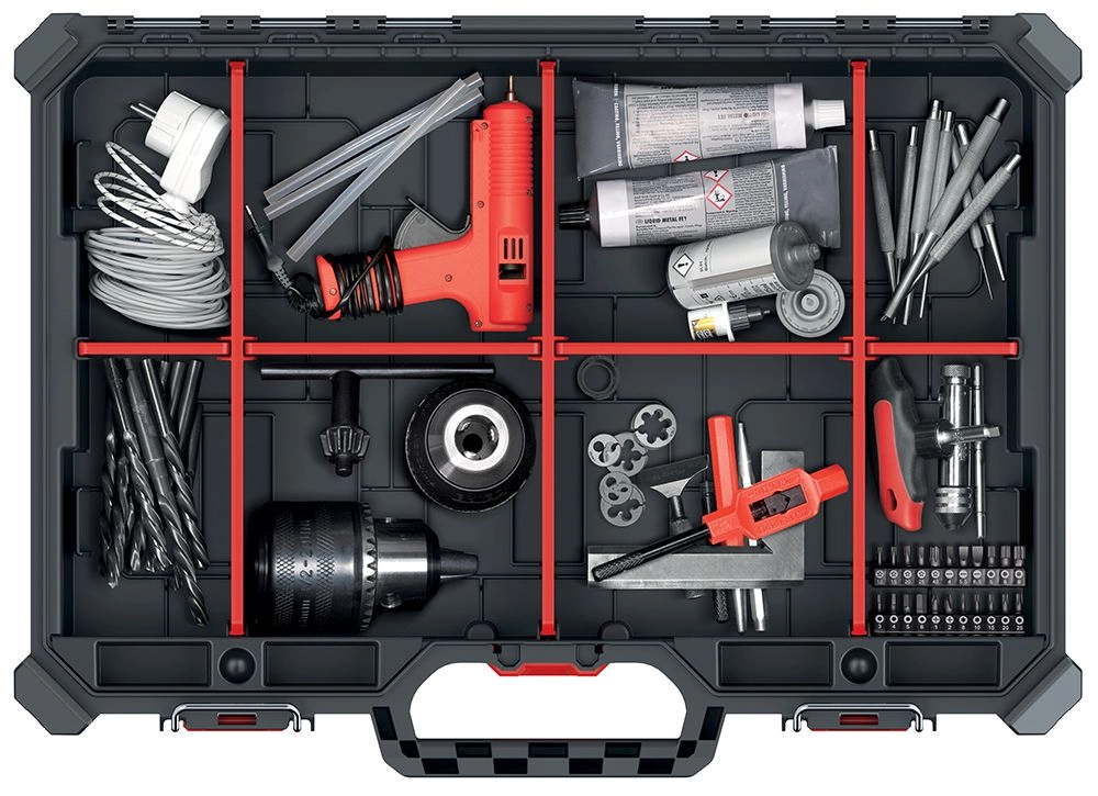 Grâce à son profil bas et à sa poignée solide, l’organiseur se transporte facilement et se range sur étagère ou dans la voiture. Les charnières métalliques, les loquets en ABS et le joint périphérique protègent efficacement les vis, chevilles ou embouts stockés de la poussière et de l’humidité.
