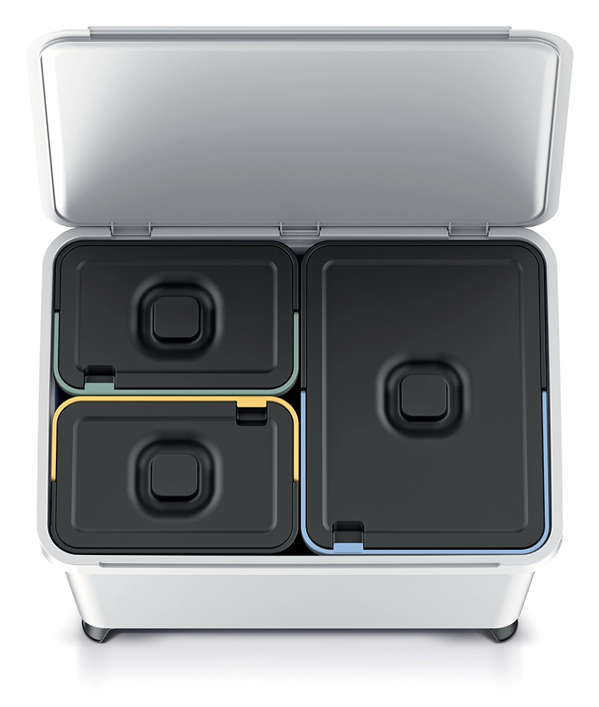 Élégante, de couleur gris cendre, la poubelle de tri PROSPERPLAST Systema allie fonctionnalité et flexibilité d’agencement. Trois bacs amovibles avec code couleur offrent suffisamment d’espace pour les déchets du quotidien et un tri clair sans compromis.