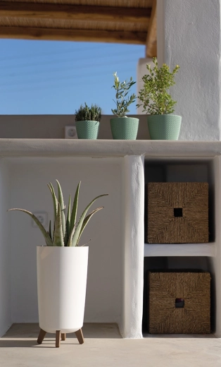 Le cache-pot Gracia Tubus Slim Eco Wood en blanc allie un look minimaliste épuré à des détails pratiques. Les pieds en bois surélevés améliorent la stabilité et la circulation de l’air sous le contenant, ce qui favorise la santé des racines et une présentation élégante des plantes. Grâce à des matériaux résistants, il convient au salon, au balcon et à la terrasse.