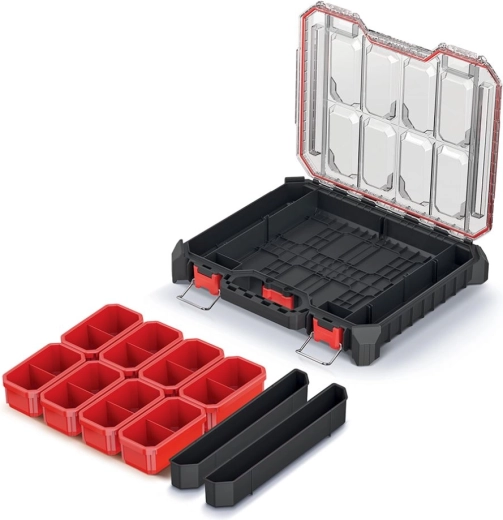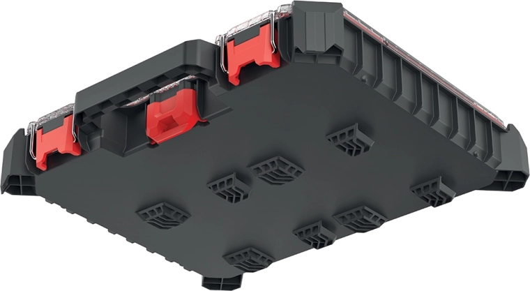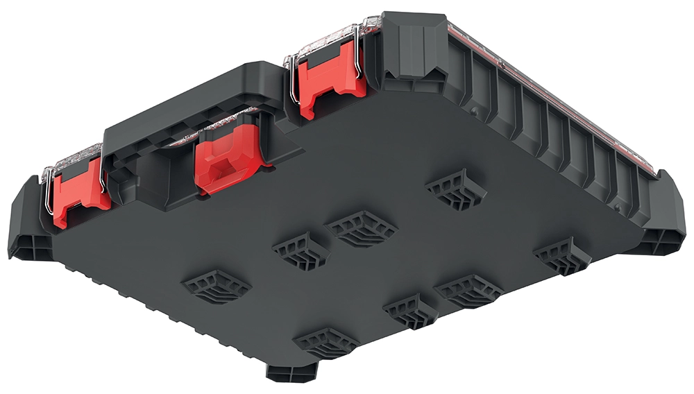 L’espace intérieur se compose de 10 bacs amovibles, facilement adaptables à vos besoins actuels. Le couvercle transparent en polycarbonate permet de vérifier le contenu d’un seul coup d’œil, tandis que le joint solide protège de la poussière et de l’eau. Des charnières métalliques et des fermetures en ABS avec éléments métalliques apportent une grande robustesse à l’ensemble.