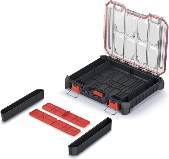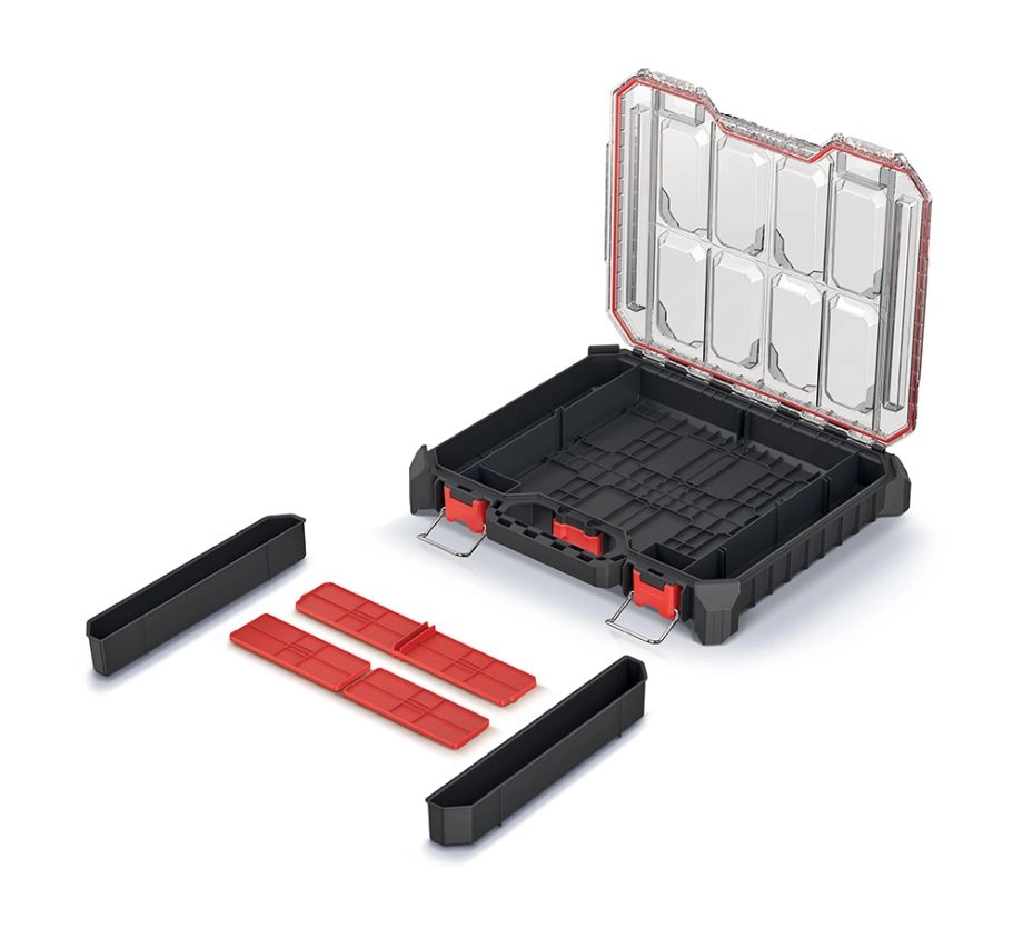 Gardez vos outils et petites pièces parfaitement organisés. Cet organiseur de couleur noire allie dimensions compactes et construction robuste, idéal aussi bien pour l’atelier que pour les déplacements. Le couvercle transparent en polycarbonate offre une visibilité immédiate du contenu, tandis qu’un joint de qualité le protège de la poussière et de l’humidité.