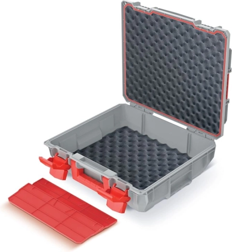 Grâce à l’IP55, elle résiste à la poussière et aux projections d’eau, tandis que les verrous en ABS maintiennent solidement le couvercle fermé. Deux cloisons amovibles permettent de configurer l’espace intérieur selon les besoins du moment et la poignée intégrée facilite la manipulation, même à pleine charge jusqu’à 25 kg. Ses dimensions compactes de 45 × 38 × 13,5 cm trouvent facilement leur place à l’atelier, dans la voiture ou en service.